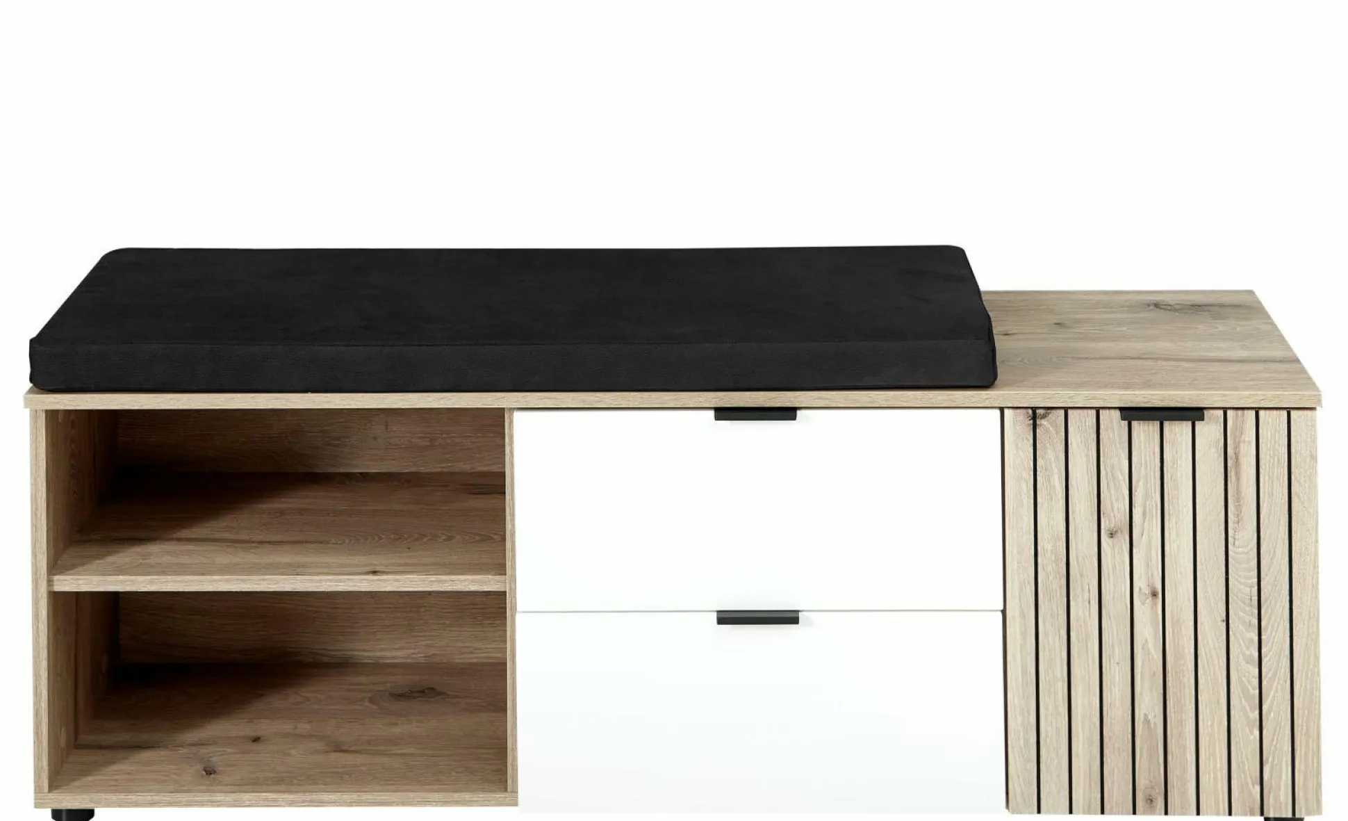 Entdecken Sie die vielseitige Bank der SENYO Garderobe von vito. Die Front und der Korpus aus Eichen Nachbildung verleihen dem Ganzen eine natürliche Ästhetik, während die Akzente in Leistenoptik den Stil optimal ergänzen. Mit einer Tür, zwei offenen Fächern und zwei Schubkästen bietet sie praktischen Stauraum. Die mittigen Schubladen setzen sich durch die weiß matte Front von dem Rest ab. Zwei Einlegeböden ergänzen die Funktionalität und schaffen Ordnung. Das inkludierte Sitzkissen in anthrazitfarbener Lederoptik sorgt für Komfort und Stil. Entdecken Sie das gesamte SENYO Garderobensystem von vito und kombinieren Sie die Möbelstücke nach Ihren Vorstellungen für ein einheitliches Gesamtbild.