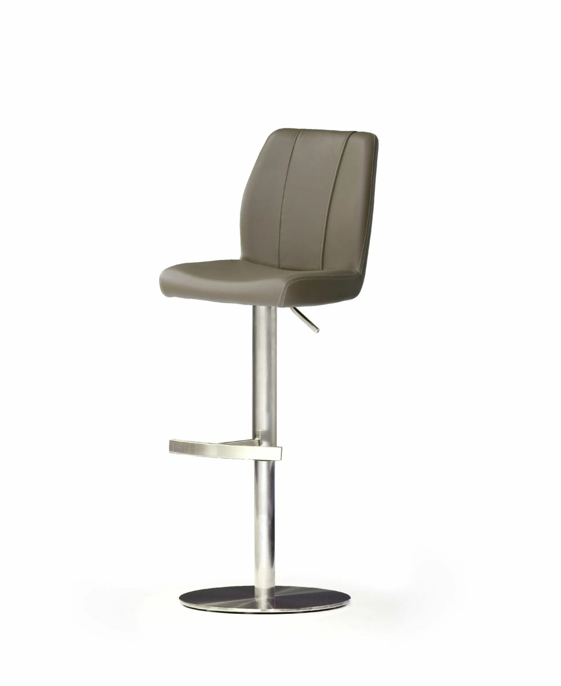 Top modern und höchst bequem präsentiert sich der Barhocker in einem cappucinofarbigen Leder. Der Barstuhl mit einem runden Edelstahlgestell lässt sich in der Höhe zwischen 89 und 114 cm verstellen. Ein Tellerfuß mit eckiger Liftsäule und Fußstütze rundet das attraktive Design des Hockers ab.