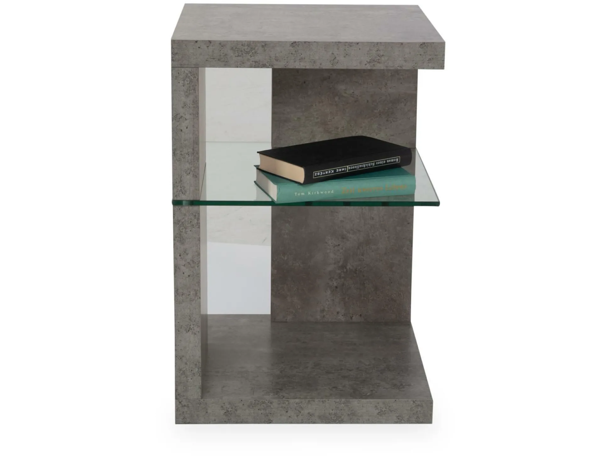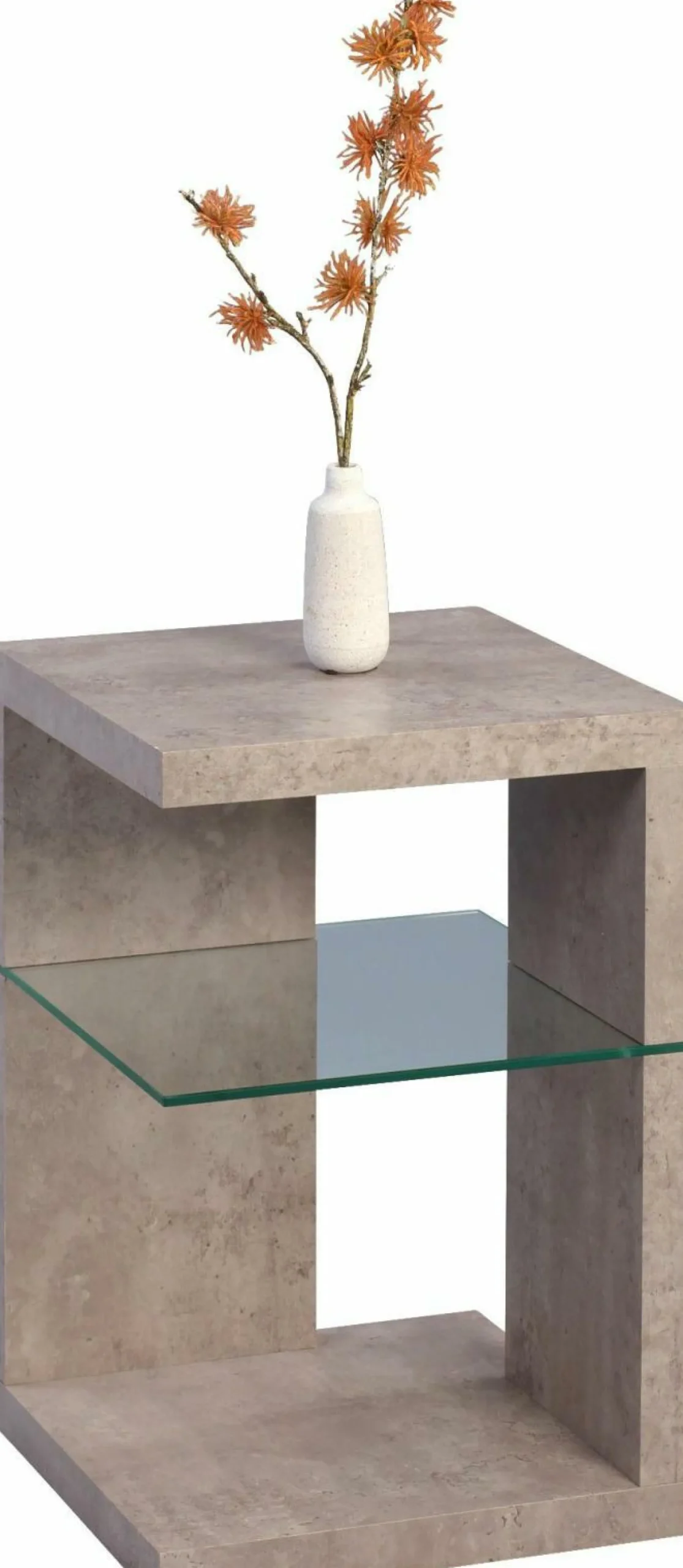Der Beistelltisch Domingo aus Dekor Betonoptik sorgt für schicke Akzente im Wohnbereich. Das moderne Element wird von einer klaren Sicherheitsglasablage begleitet. So können Sie stilvoll Snacks, Bücher und weitere Utensilien auf dem Tisch drapieren, um diese beim Fernsehen griffbereit zu haben.