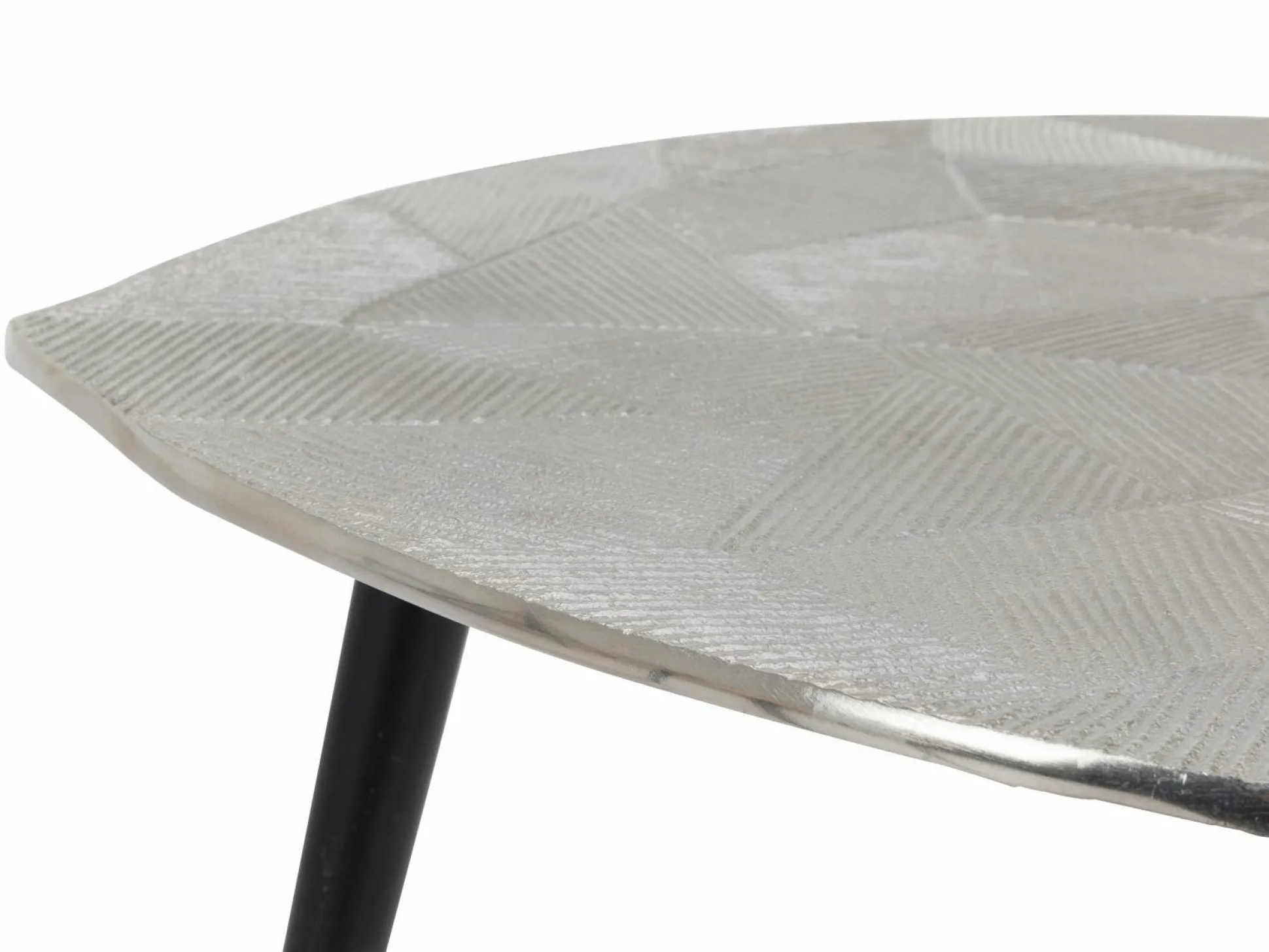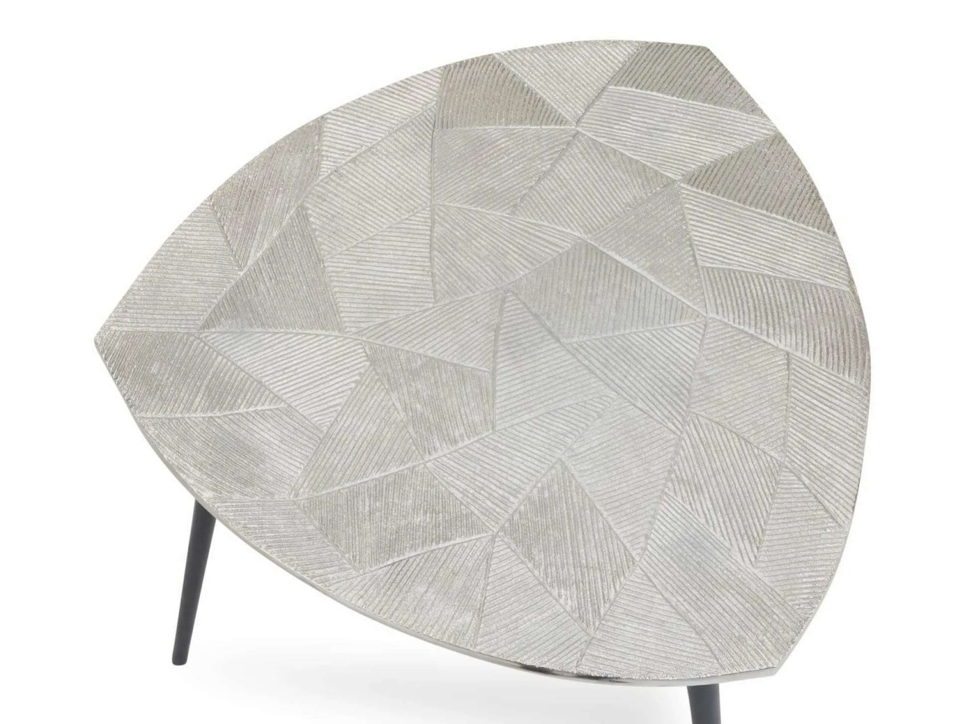 Der Beistelltisch Melly 2 von M2 KOLLEKTION verfügt über eine dreieckige, geschwungene Metallgussplatte in Silberoptik und filigrane, kegelförmige Metallbeine. Die gemaserte, silberfarbige Tischplatte steht in edlem Kontrast zum tiefen Schwarz der Tischbeine und lässt den Tisch in jeder Räumlichkeit zum besonderen Hingucker werden.