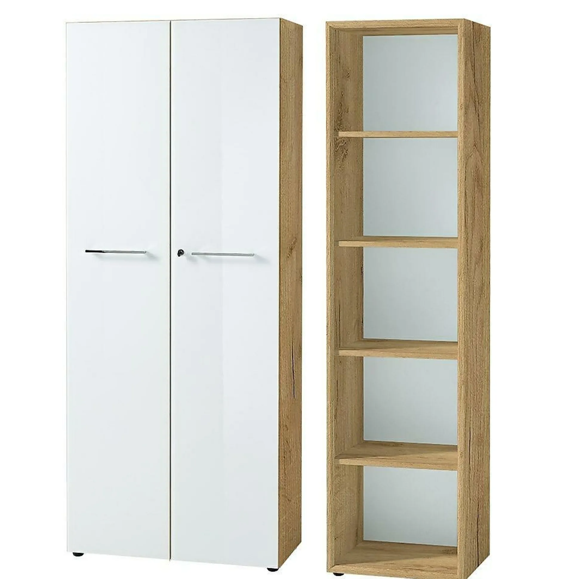 · Set bestehend aus einem Aktenschrank und einem Aktenregal, Aktenschrank mit abschließbaren Türen, dahinter vier feste Böden, Aktenregal mit vier festen Böden und 3D-Rahmen mit Gehrung MDF-ummantelt, insgesamt zwei Relinggriffe aus Chrom und acht schwarze Möbelgleiter, Fronten mit Glasauflage, Korpus in Navarra-Eiche-Nb., Glaselemente in Weiß, Türdämpfung, Melaminharzbeschichtung, hochwertige ABS-Kanten, Made in Germany.