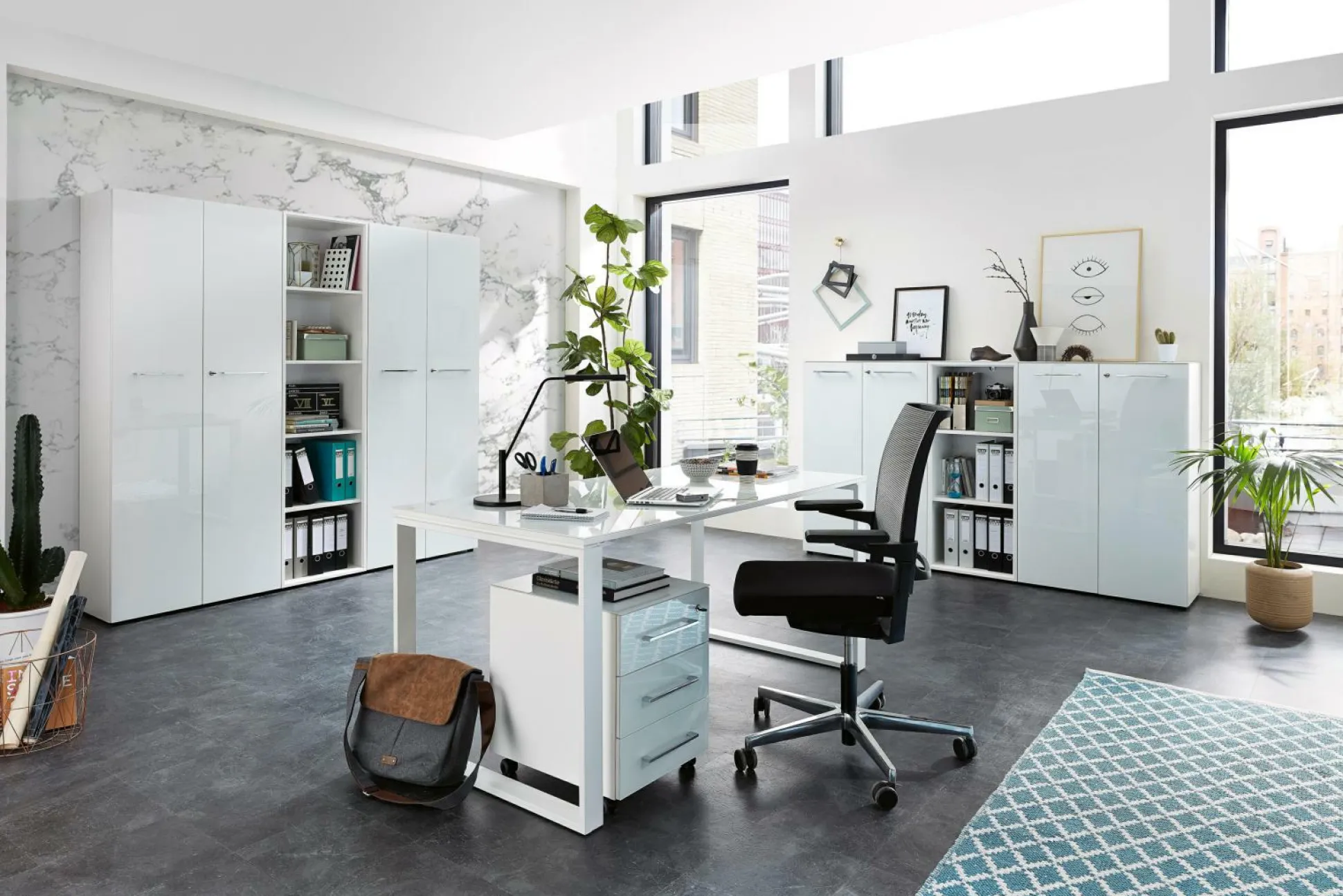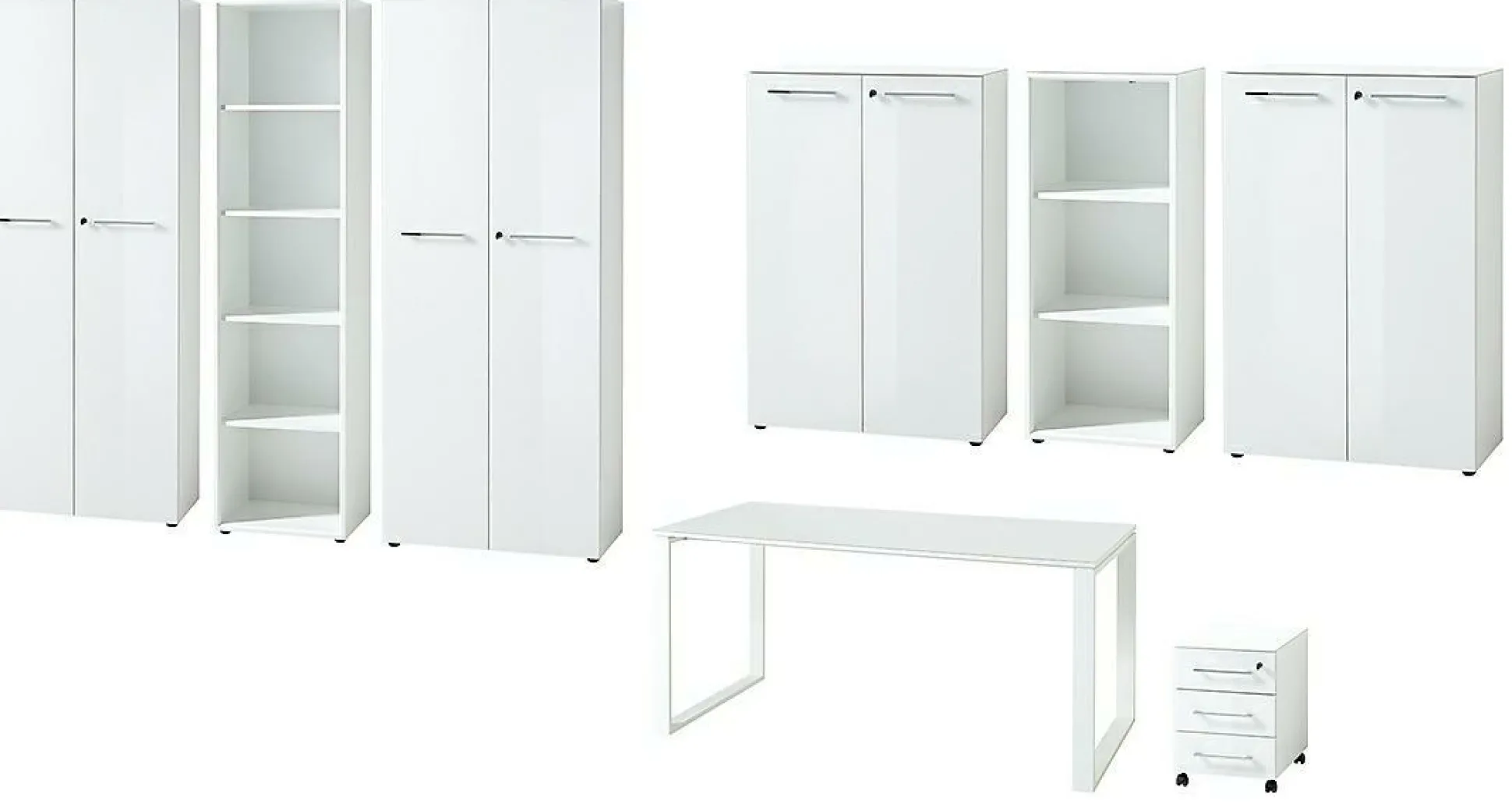 · Büromöbel-Set bestehend aus einem Schreibtisch, einem Rollcontainer, zwei halbhohen und zwei hohen Aktenschränken sowie einem halbhohen und einem hohen Aktenregal, Schreibtisch mit pulverbeschichteten Metallkufen und Glasauflage (belastbar bis zu 30 kg), Rollcontainer auf Laufrollen mit drei Schubladen, davon eine abschließbar, halbhohe, abschließbaren Aktenschränken, mit zwei festen Einlegeböden, hohe, abschließbare Aktenschränke mit vier festen Einlegeböden, halbhohes Aktenregal mit zwei festen Einlegeböden und hohes Aktenregal mit vier festen Einlegeböden, alle Möbel in Weiß, insgesamt elf verchromte Relinggriffe aus Metall, insgesamt 24 schwarze Möbelgleiter, mit Glasfronten und -auflage, Melaminharzbeschichtung, Hochwertige ABS-Kanten, Türdämpfung, Selbsteinzug der Schubladen, Made in Germany.