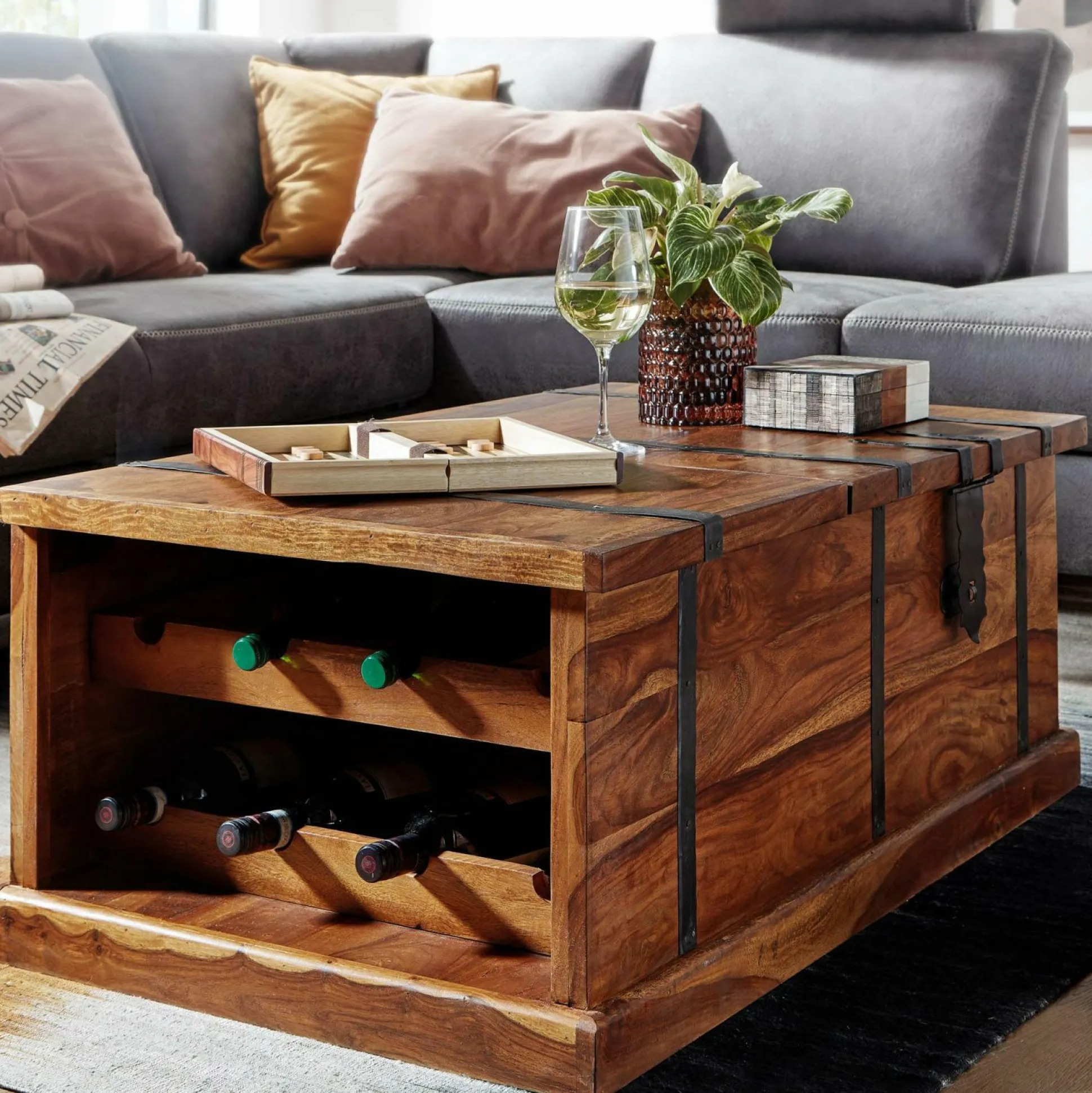 · Alles in einem – Ein integriertes Weinregal hält die edlen Tropfen bereit. In den Fächern unter der Snacks, Decken und Kissen ihren Platz.