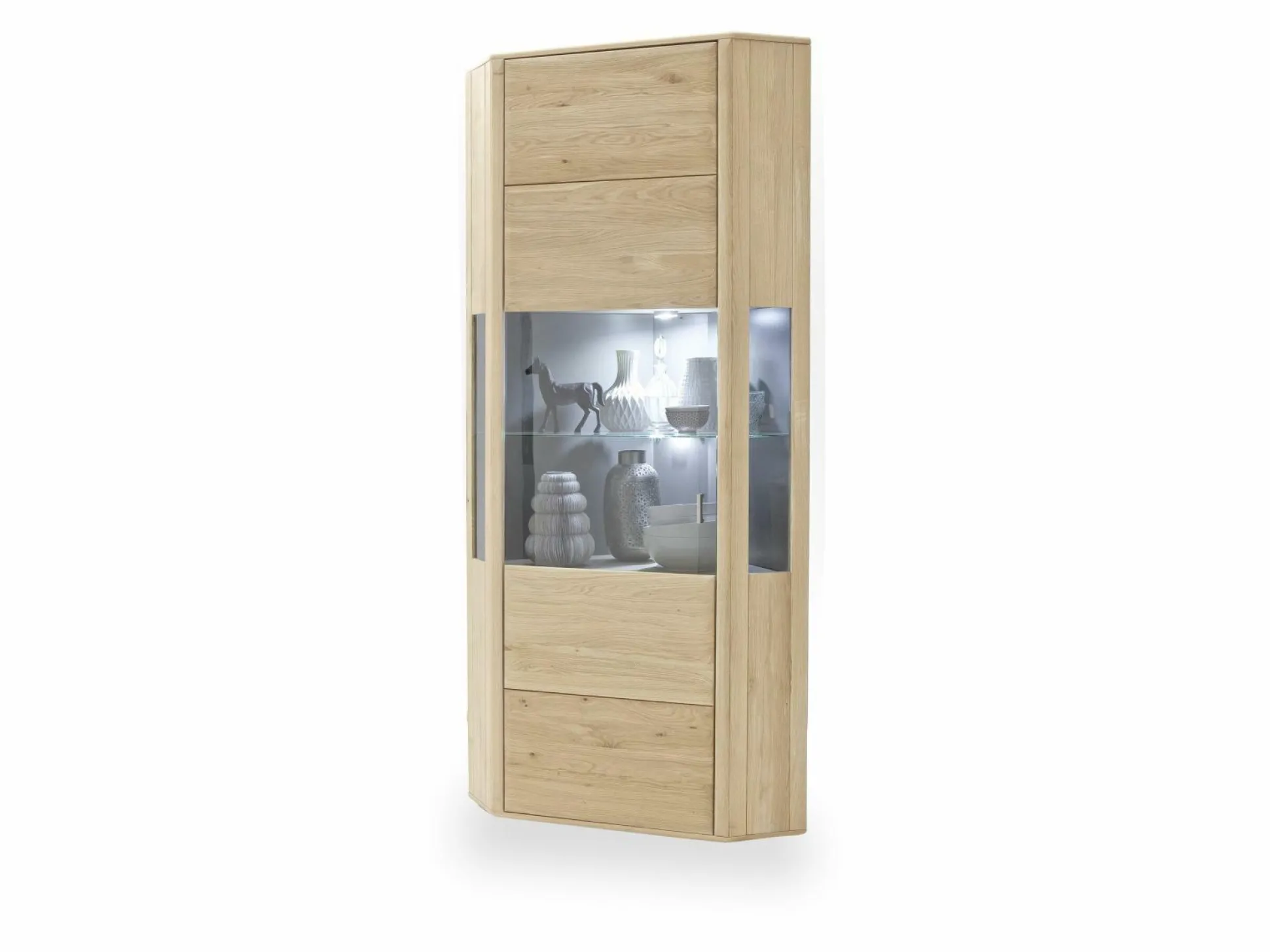 Die Eckvitrine Tarragona von MCA besitzt ein zeitloses Design, das in viele Einrichtungsstile integrierbar ist. Bei dem Material handelt es sich um Eiche Bianco teilmassiv, wobei die Oberfläche geölt ist. Sowohl durch die Form als auch durch die Farbe spiegelt dieses Möbelstück einen schlichten, aber schicken Stil wider. Hinter der großen Tür können Sie diverse Gegenstände wie Geschirr etc. wunderbar verstauen. Durch den Glaseinsatz können Sie Ihre Lieblingsgegenstände sogar zur Schau stellen. Ob im Wohn- oder Esszimmer – diese Eckvitrine ist nicht nur super schön, sondern dazu im Alltag auch noch sehr nützlich.