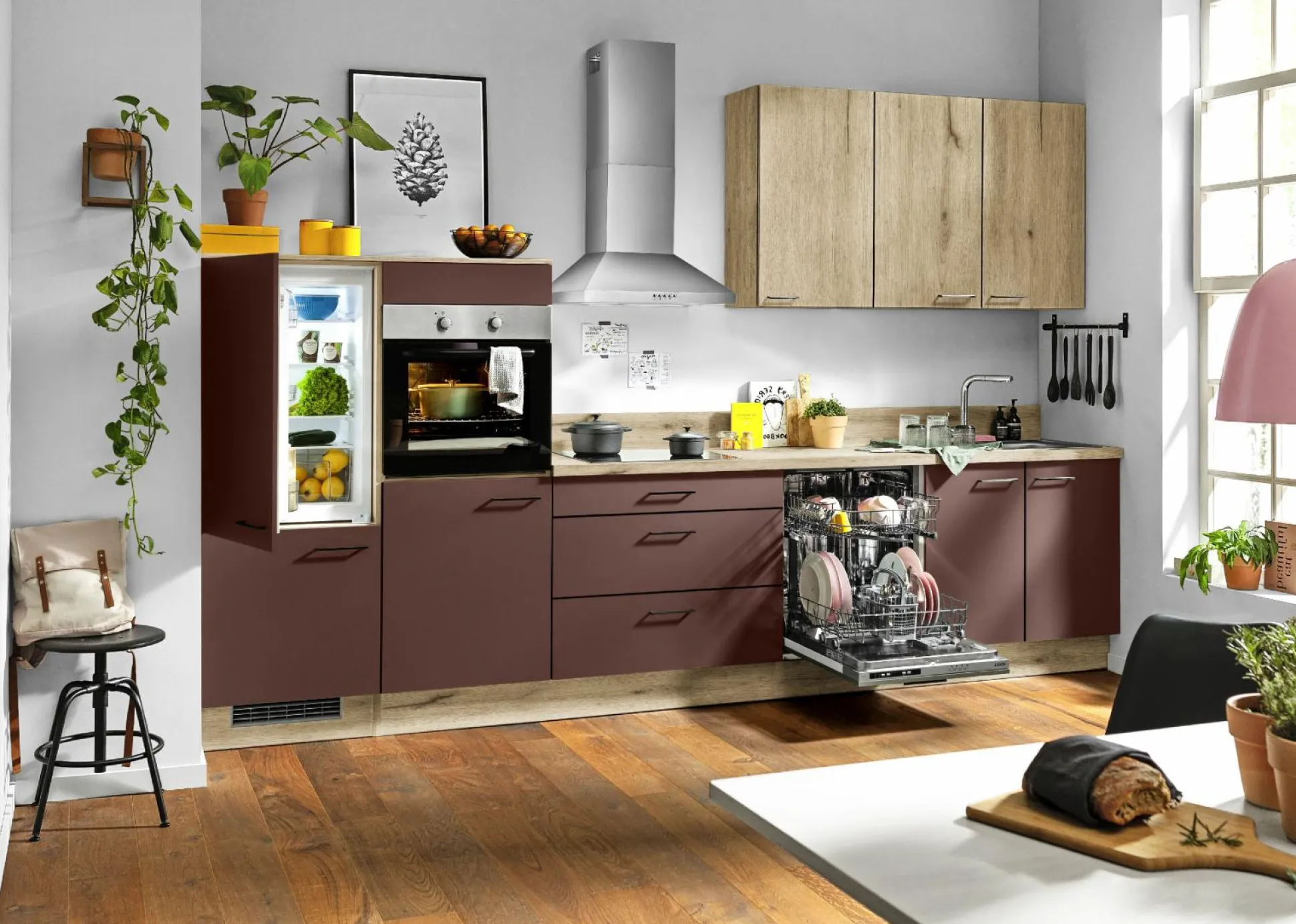Front: Karminrot Zu der Küche gehören folgende E-Geräte: PREMIERE: Backofen: 0236247, EEK:A, 235214 PREMIERE: Kochfeld 344504 Glaskeramik PREMIERE: Dunstabzugshaube: 0236236, EEK:A 3728673 PREMIERE: Kühlschrank: 0562444, EEK:E, 361726 AUF WUNSCH GEGEN MEHRPREIS: Nischenausstattung und Zubehör Geschirrspüler