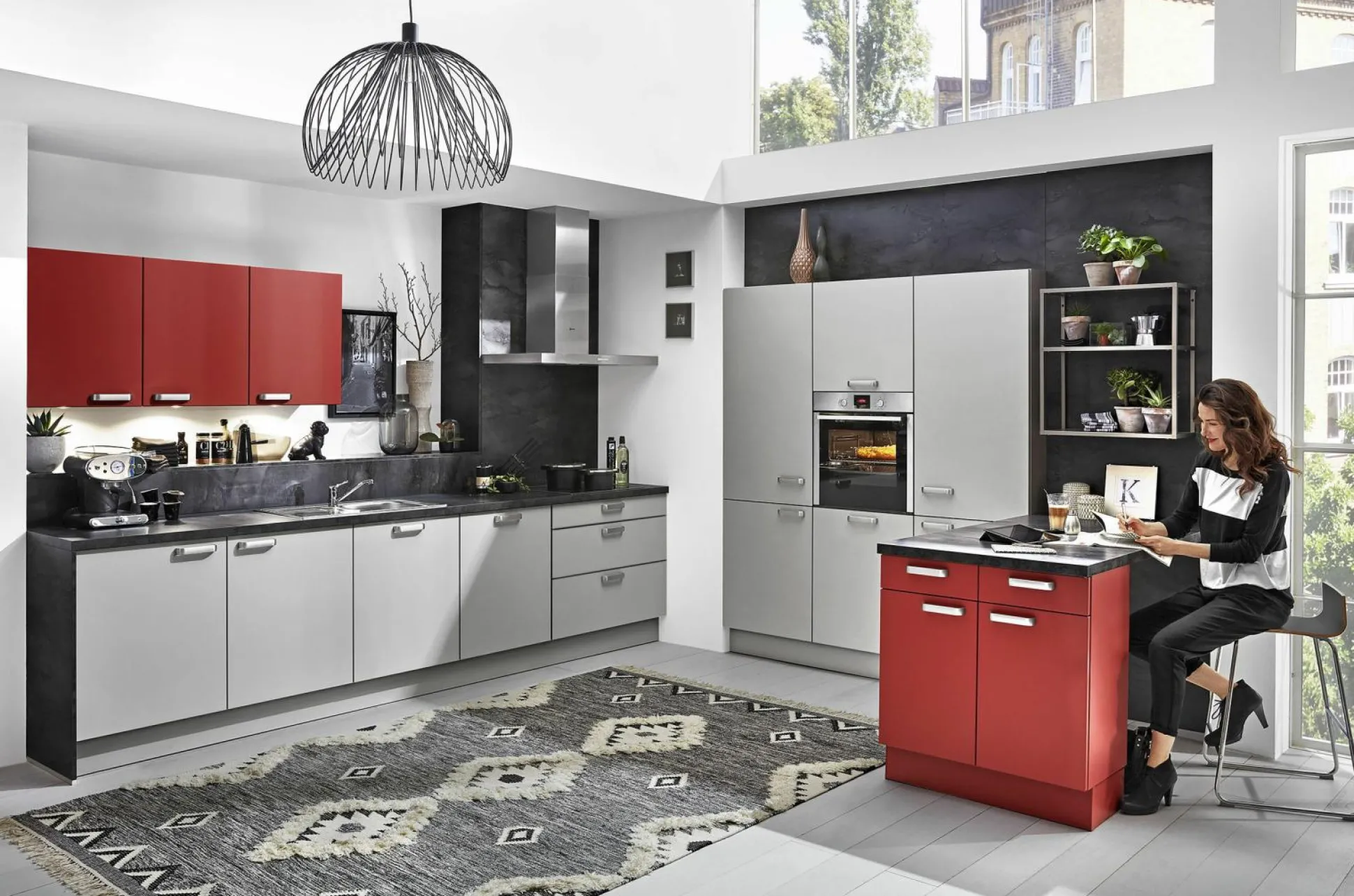Front: grau / rot Zu der Küche gehören folgende E-Geräte: BOSCH: Backofen: 0695657, EEK:A, HBF133BR0 BOSCH: Kochfeld PKN645BA2E Glaskeramik PREMIERE: Dunstabzugshaube: 0481570, EEK:A 3780271 BOSCH: Kühlschrank: 0415469, EEK:E, KIR21NSE0 BOSCH: Geschirrspüler: 0402315, EEK:E, SMV41D10EU AUF WUNSCH GEGEN MEHRPREIS: Nischenausstattung und Zubehör