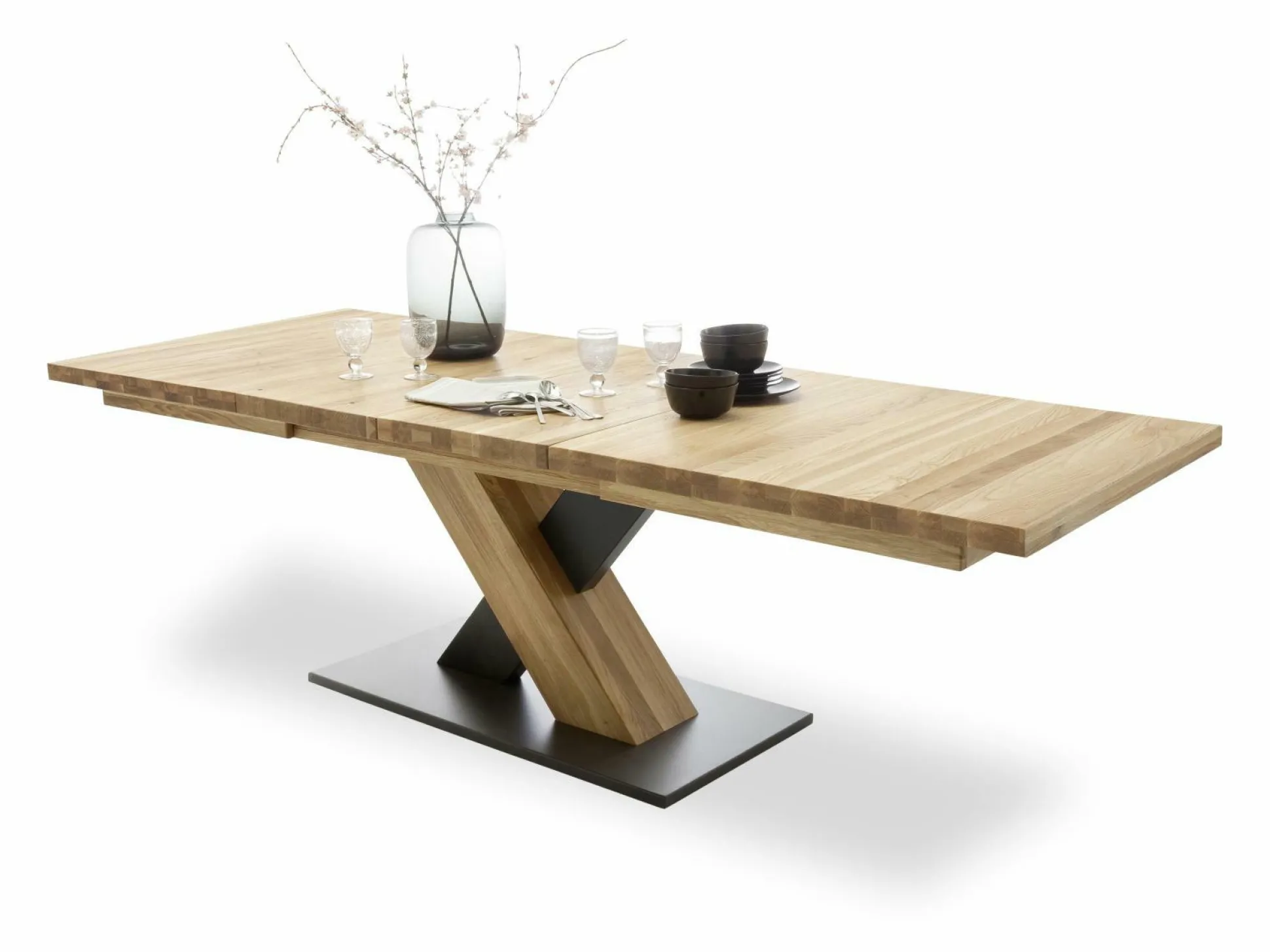 Modernes, rustikales Design und viel Platz – der Esstisch Mendoza wird Sie begeistern! Insgesamt besteht der Tisch aus geölter Wildeiche massiv und besitzt schöne, x-förmige Füße, die auf einer schwarzen Bodenplatte befestigt sind. Somit präsentiert er einen natürlichen, aber auch modernen Stil, der vielseitig kombinierbar ist. Durch seine geradlinige, eckige Form und die speziellen Tischbeine wird er in Ihrem Esszimmer zum Hingucker und bietet Ihnen eine große Tischplatte. An dem 180 cm großen Tisch, der sogar auf 270 cm ausziehbar ist, können Sie mit der Familie und Freunden die freie Zeit mit leckeren Mahlzeiten genießen!