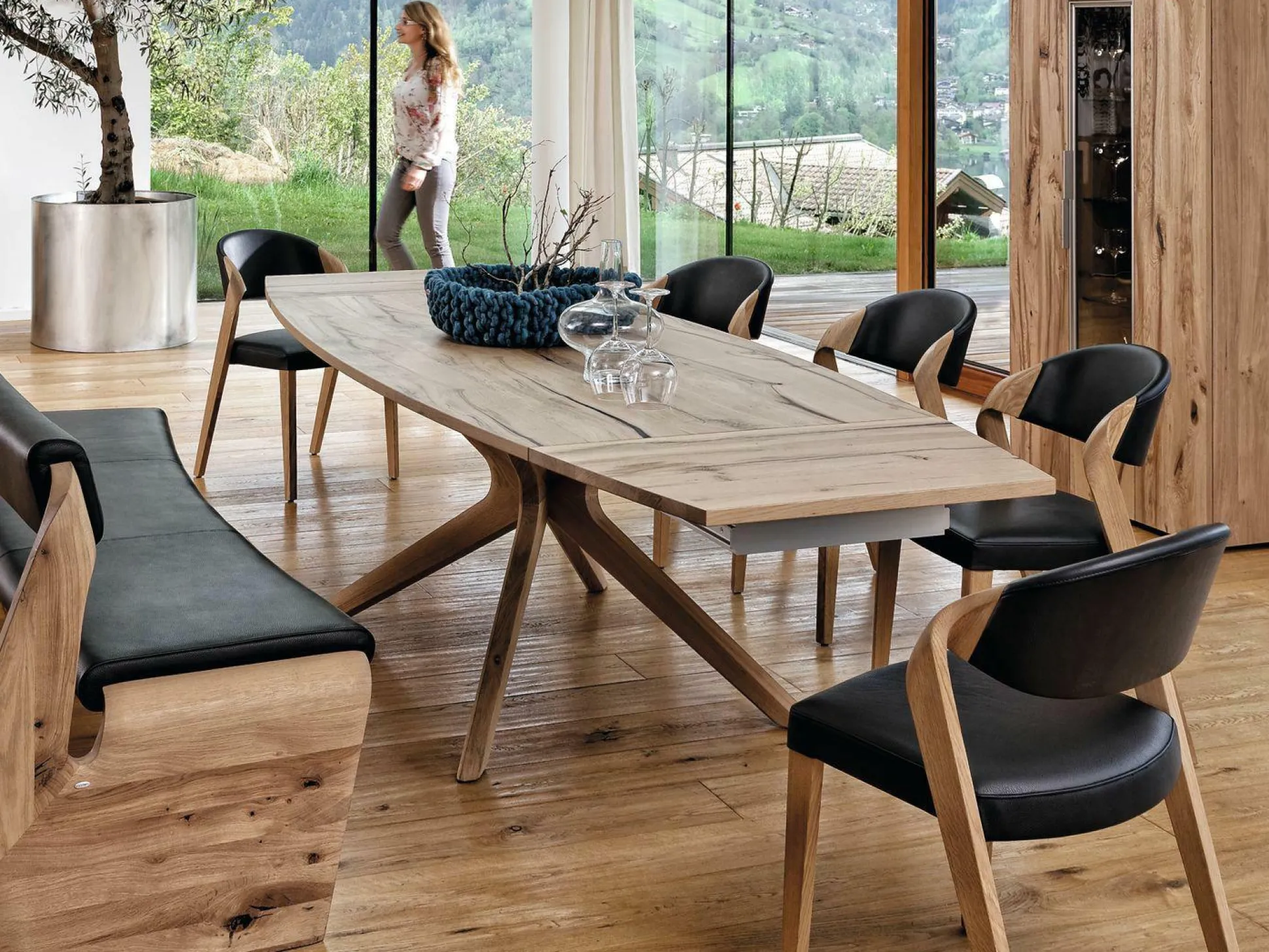 Werten Sie Ihren Wohnraum mit dem Esstisch V-Alpine aus dem Hause Voglauer gekonnt auf. Das außergewöhnliche Design lädt zu gemeinsamen Mahlzeiten zusammen mit Familie und Freunden ein. Die abgerundete Tischplatte ist aus lackierter Eiche Altholz Echtholzfurnier und steht sicher auf einem massiven Eiche Altholz Gestell. Auf Wunsch ist eine Tischverlängerung erhältlich.