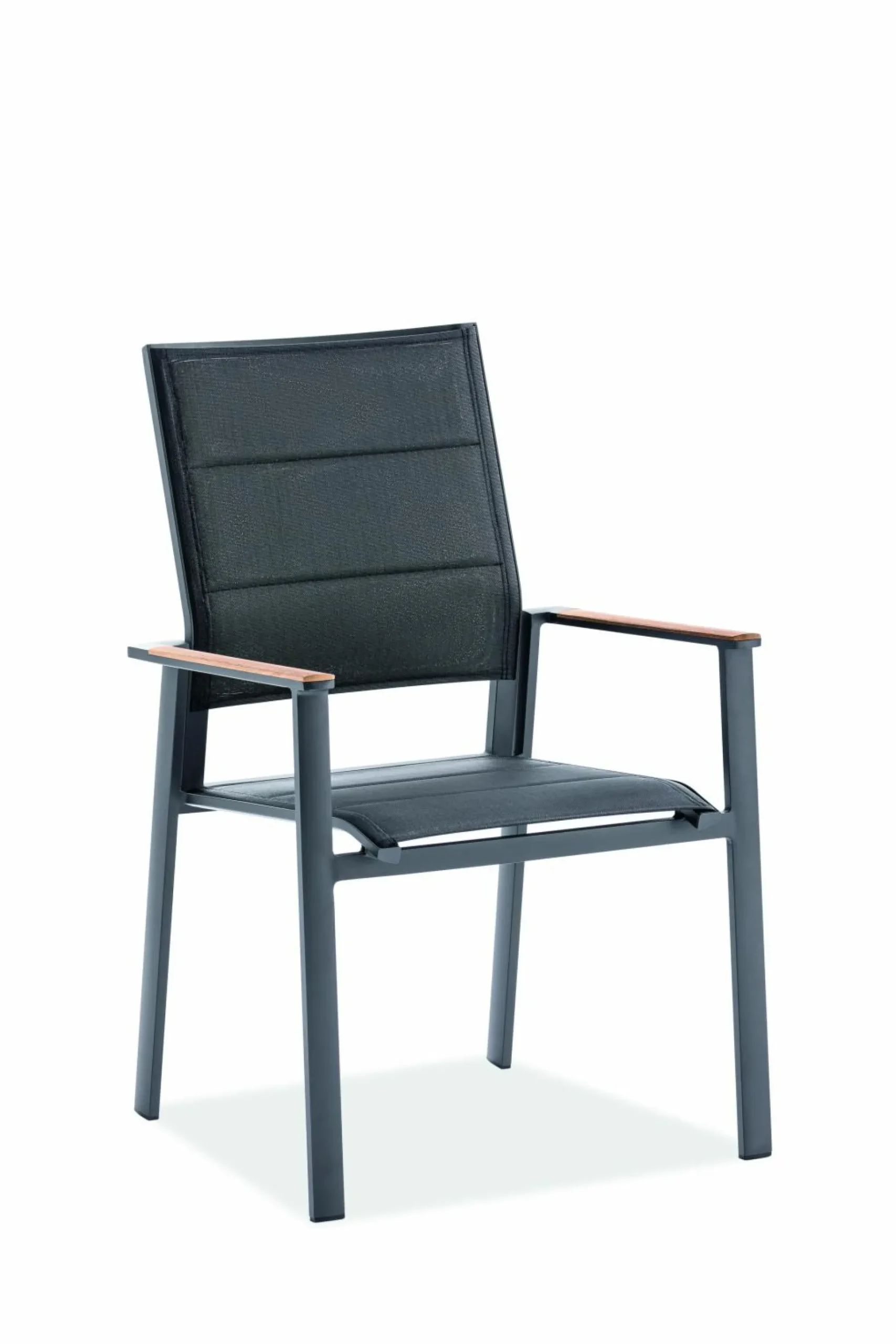· Hochlehner REVENT Sitz und Rücken in Textilen schwarz, Armlehnauflagen Teak natur, Gestell Aluminium pulverbeschichtet, Farbton anthrazit, stapelbar, 62×63 / 96 cm