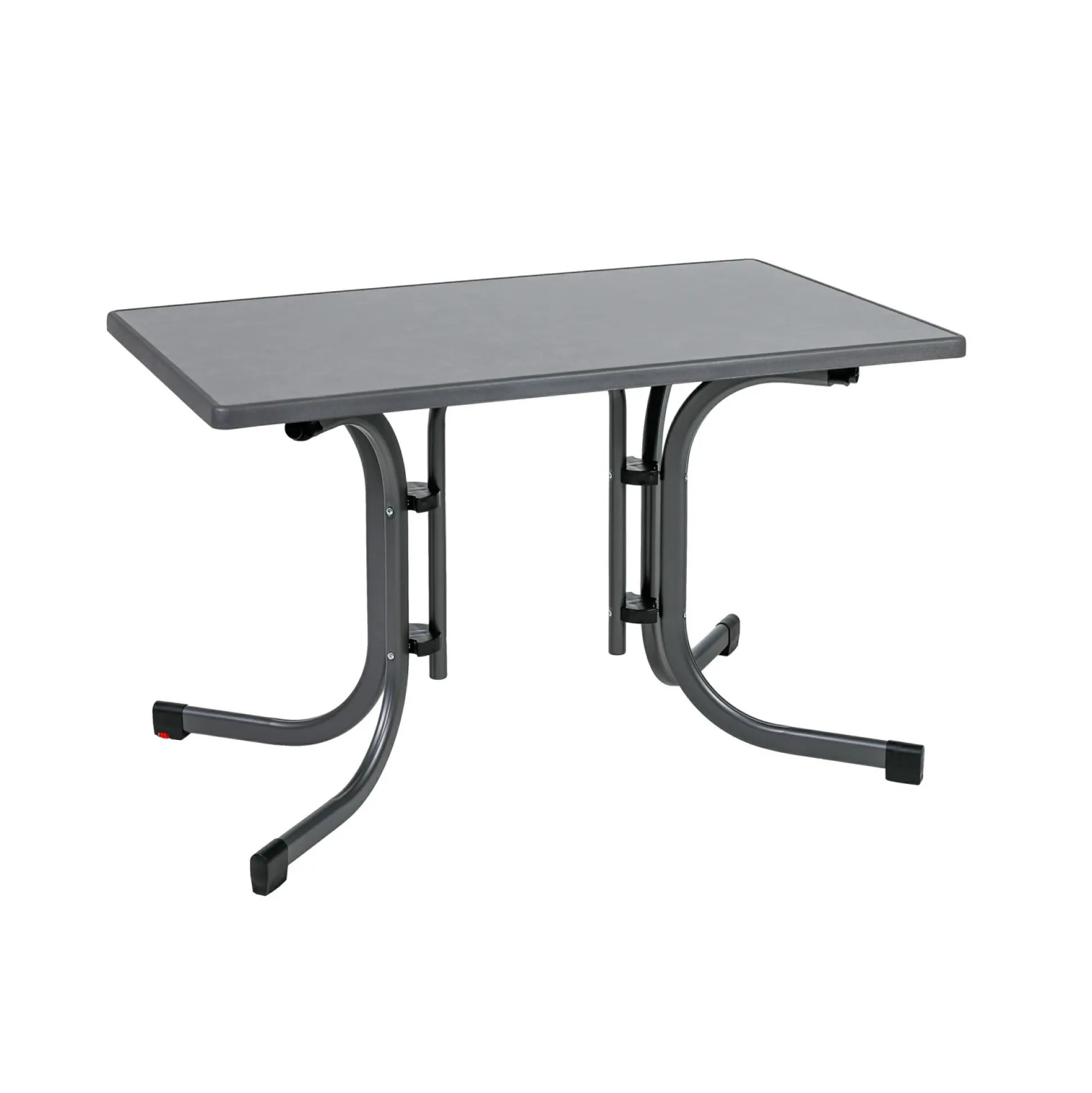 · Ein Hit – drinnen wie draußen: Der rechteckige Klapptisch ist der perfekte Begleiter durch die Gartensaison und findet auch in der kalten Jahreszeit Einsatz, zum Beispiel im Wintergarten, im Kreativ- oder Werkraum. Clever: Durch die nützliche Niveauregulierung lassen sich kleinere Bodenunebenheiten bestens ausgleichen, sodass das Möbelstück in der Waage steht. Es kombiniert ein robustes Stahlgestell mit einer anthrazitfarbenen Tischplatte aus MDF. Dank der praktischen Kunststoffbeschichtung verfügt der Tisch über eine hohe Beständigkeit gegen Witterungseinflüsse – perfekt für den Outdoor-Bereich. Mit seiner ca. 115 x 70 cm messenden Tafel ist er für Gruppen von vier bis sechs Personen geeignet. Besonderer Vorteil ist die zweckmäßige Klappfunktion, sodass der Einrichtungsgegenstand platzsparend verstaut werden kann – perfekt, wenn es so gut klappt.