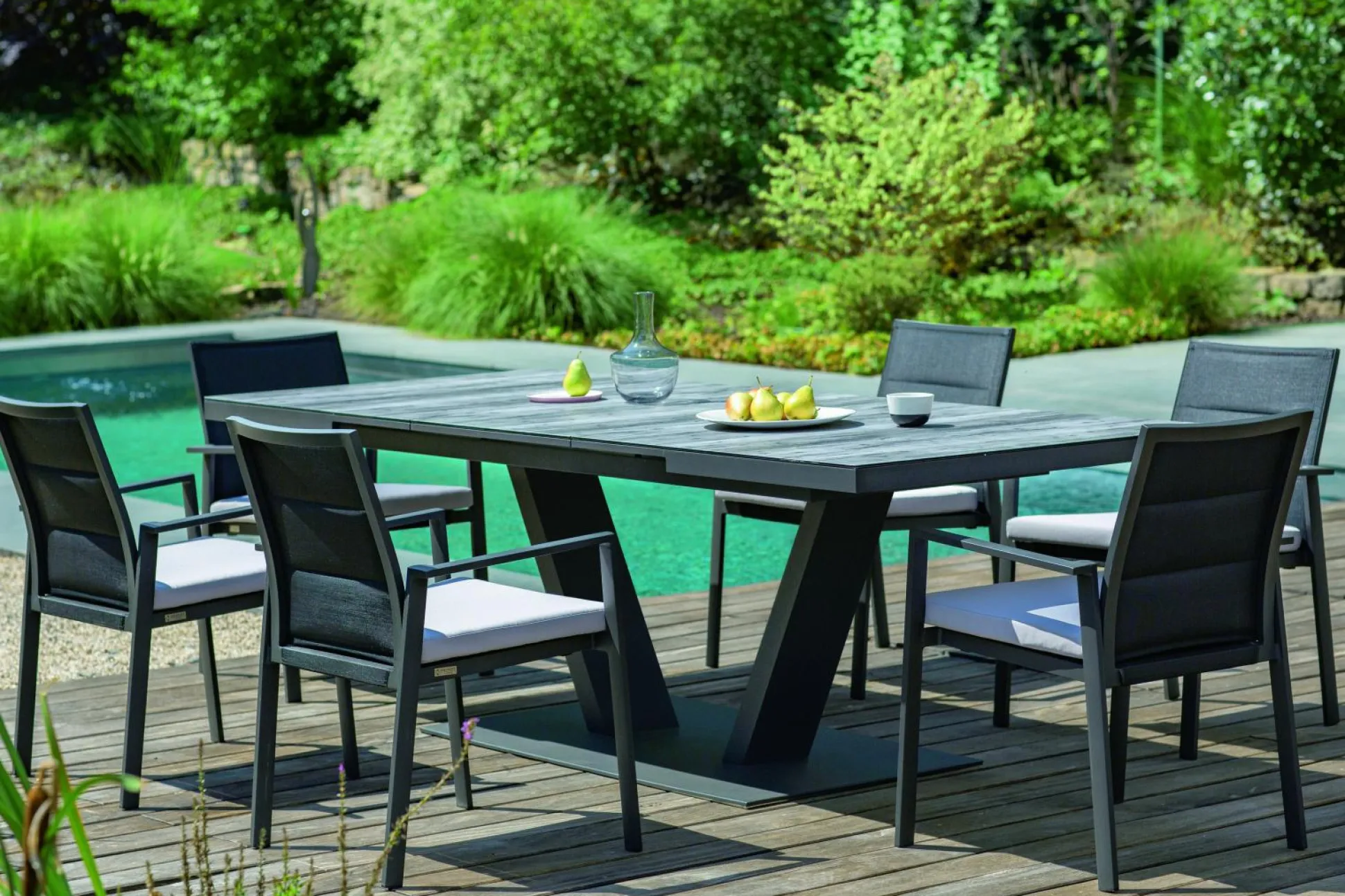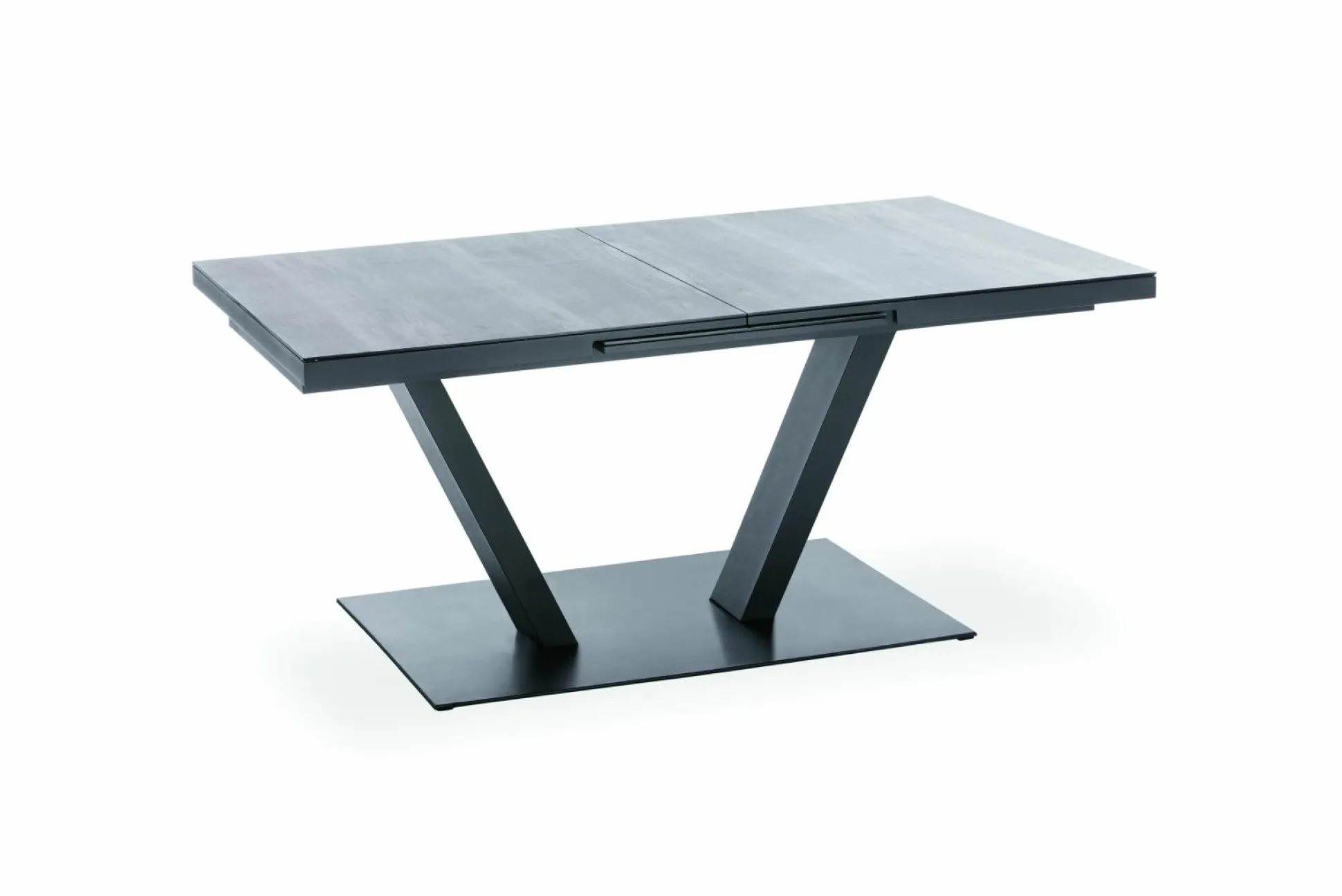 · Ausziehtisch Tischplatte mit Glasauflage mit Keramikbeschichtung in Holzoptik grau mit 2(3) Segmenten, Synchronauszug 60 cm, Gestell Aluminium pulverbeschichtet, Farbton anthrazit, 180(240)x100 / 76 cm