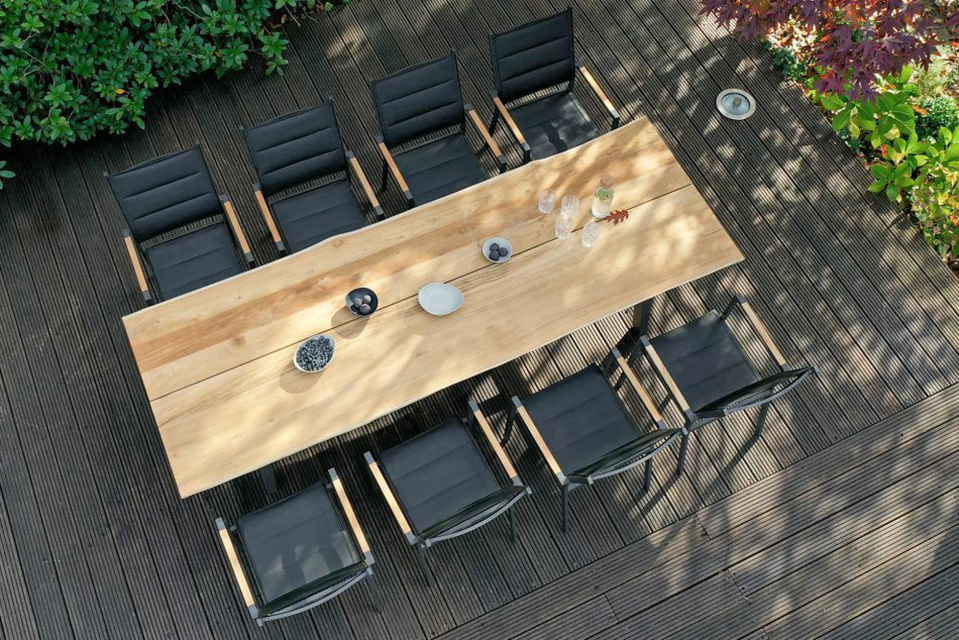 · Tisch TAVO Tischplatte Teak gebürstet mit Baumkante, Gestell mit Steg Aluminium pulverbeschichtet, Farbton antrazit, L 240 B 95 H 76 cm