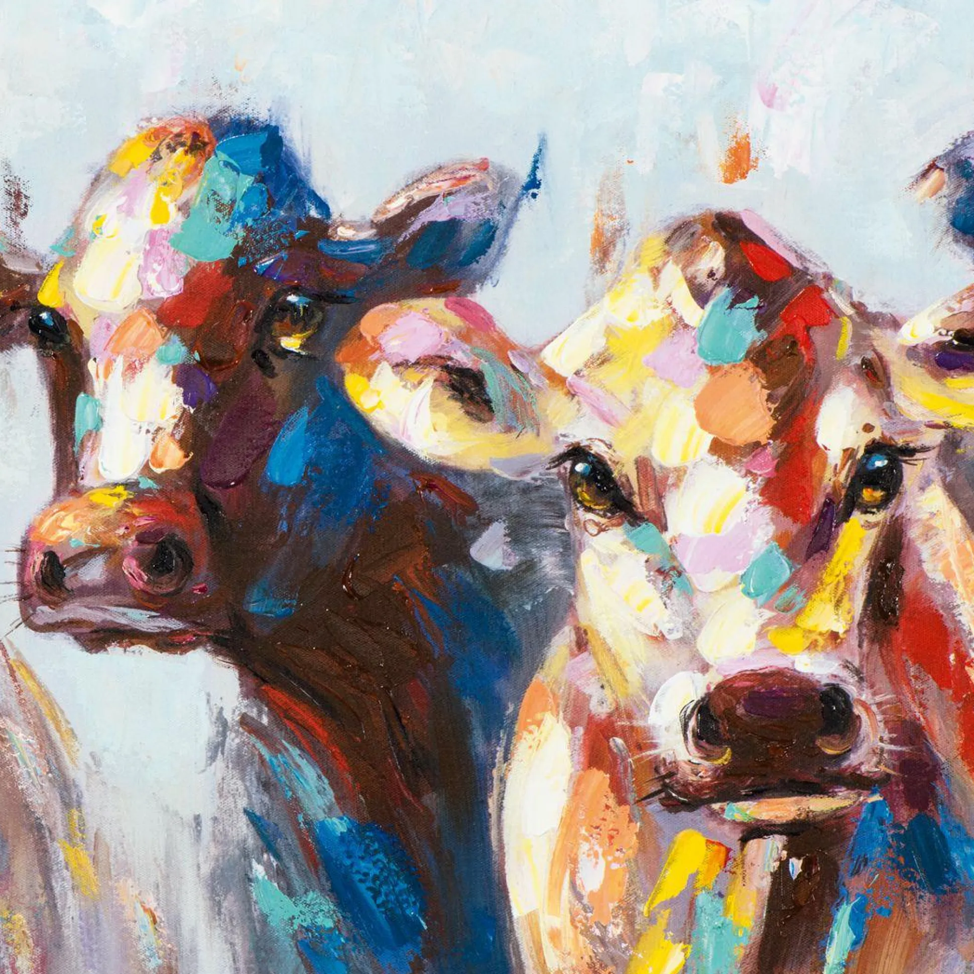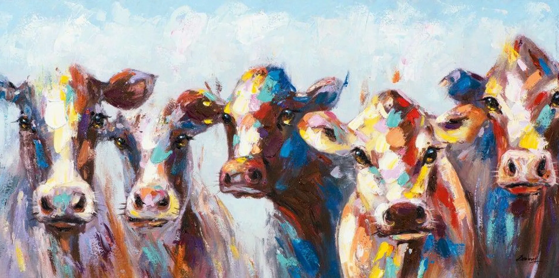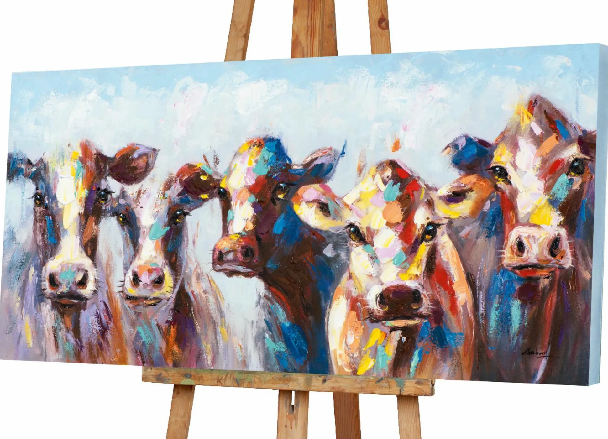 Das Bild Kühe wird durch die schöne Farbgebung zum stilvollen Highlight im Raum. Insgesamt ist das Bild 70 cm x 140 cm groß, wobei die Leinwand auf einen Holzrahmen gezogen wurde. Bei diesem Bild handelt es sich um ein Original. Das bunte Motiv der Kühe strahlt eine Freundlichkeit aus, die alle Blicke auf sich zieht. Setzen Sie mit diesem Element einen besonderen Akzent an Ihrer Wand.