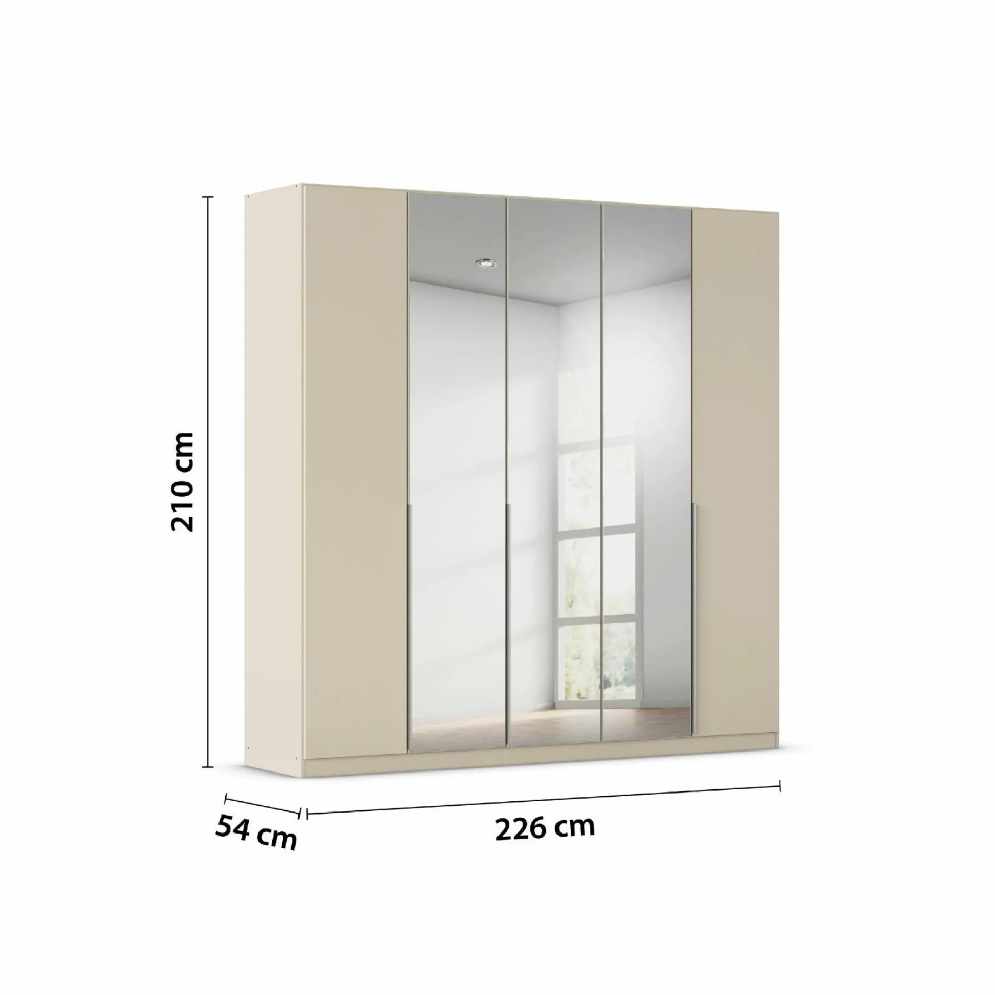 · Drehtürenschrank 5-trg., mit zwei Holztüren außen und drei Spiegeltüren mittig