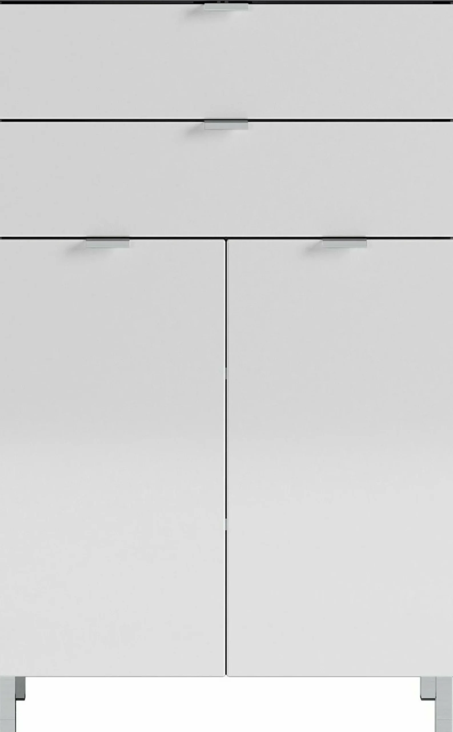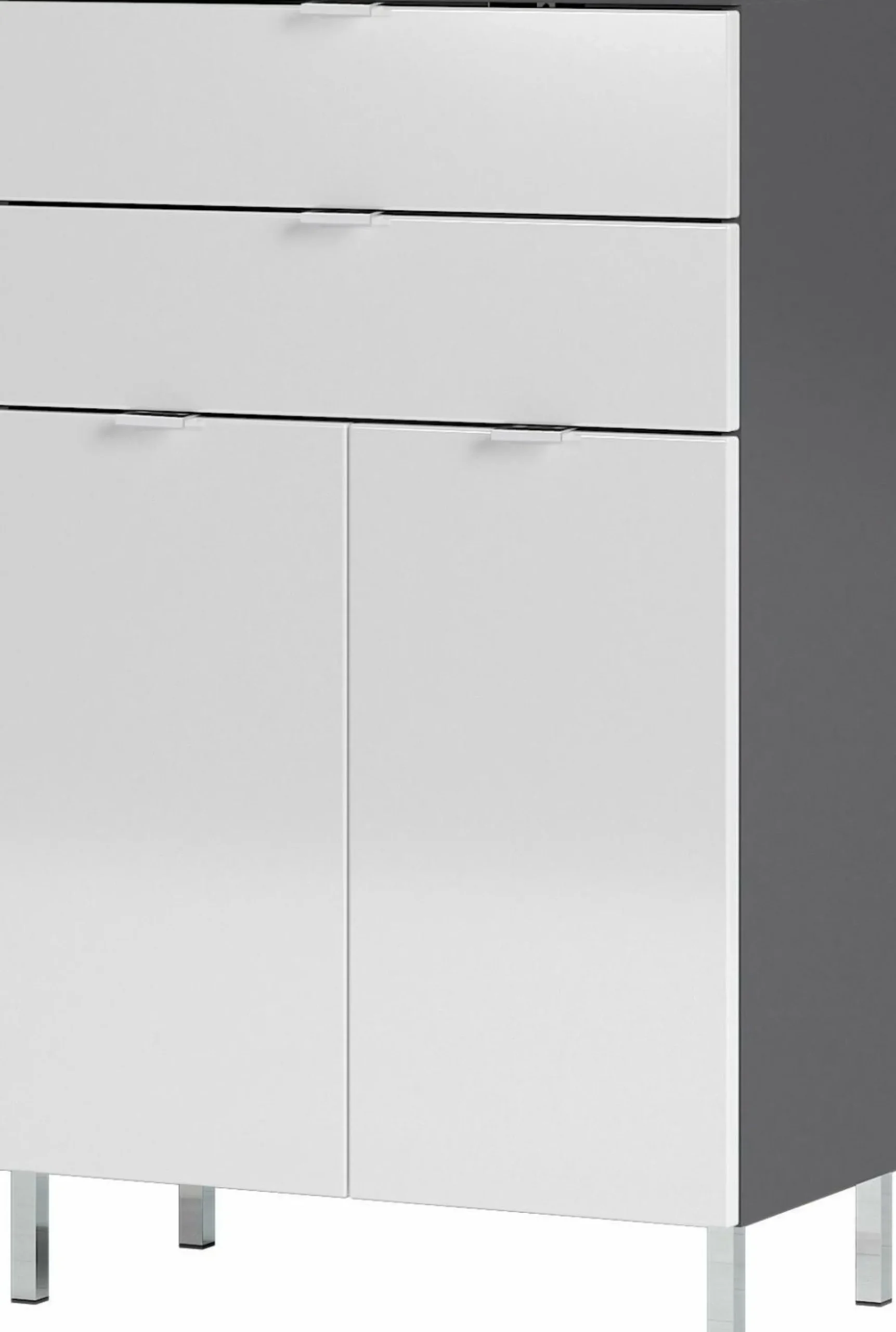· Kommode mit zwei Schubladen (belastbar bis zu 10 kg) und zwei Türen – dahinter zwei verstellbare Einlegeböden (belastbar bis zu 10 kg), Oberboden belastbar bis zu 10 kg, Korpus in Graphit, Fronten in Weiß, vier Kantengriffe und vier Füße aus Metall in der Farbe Chrom, Melaminharzbeschichtung, hochwertige ABS-Kanten, Fronten MDF-tiefgezogen und hochglänzend, Türdämpfung, Selbsteinzug der Schubladen, Made in Germany