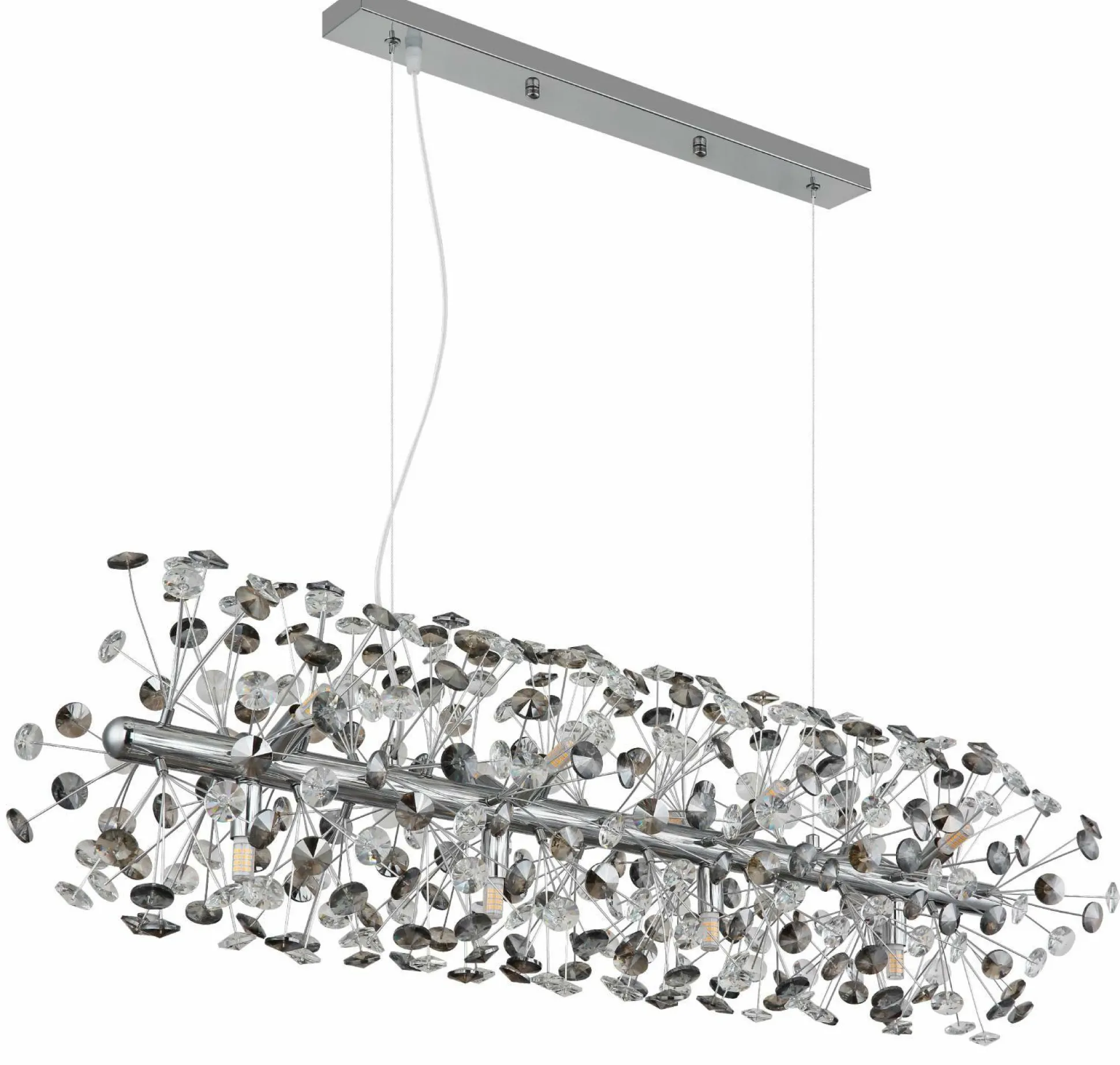 Setzen Sie mit dieser formschönen Hängeleuchte tolle Lichtakzente und verleihen Sie Ihrem Interieur eine besondere Note. Bringen Sie mit der Lampe die GLOBO-Lighting-Markenqualität in Ihre vier Wände. Durch das hübsche Design harmoniert die Lampe mit beinahe jedem Einrichtungsstil und ist eine Bereicherung für jedes Zimmer. Sie ist 30 Zentimeter breit, besitzt eine Länge von 90 Zentimetern und hat eine Gesamthöhe von 150 Zentimetern. Die Leuchte kommt mit einer G9-Fassung. Sie wird sich perfekt in Ihre Wohneinrichtung integrieren und sorgt dort für ein persönliches Flair. Um das Konzept Ihres Raumes gelungen abzurunden, eignet sich die Hängeleuchte aus Metall ausgezeichnet. Sie erfüllt auch ausgeschaltet eine dekorative Funktion.