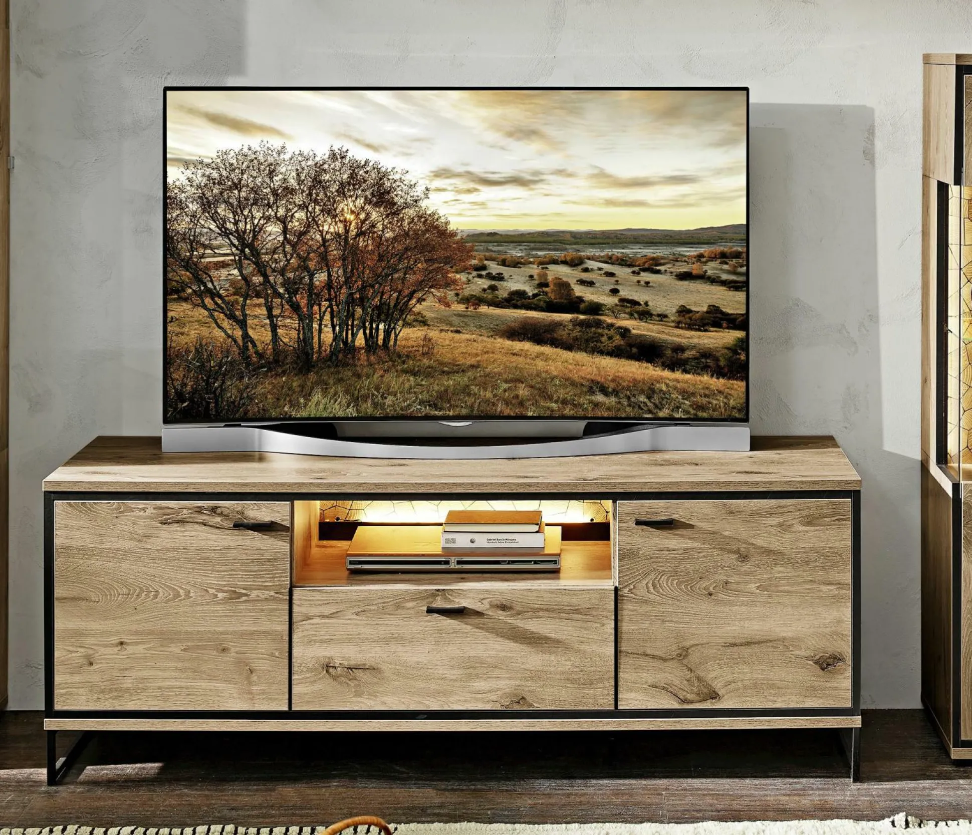 · 2 Holztüren, 1 offenes Fach und 1 Schubkasten
