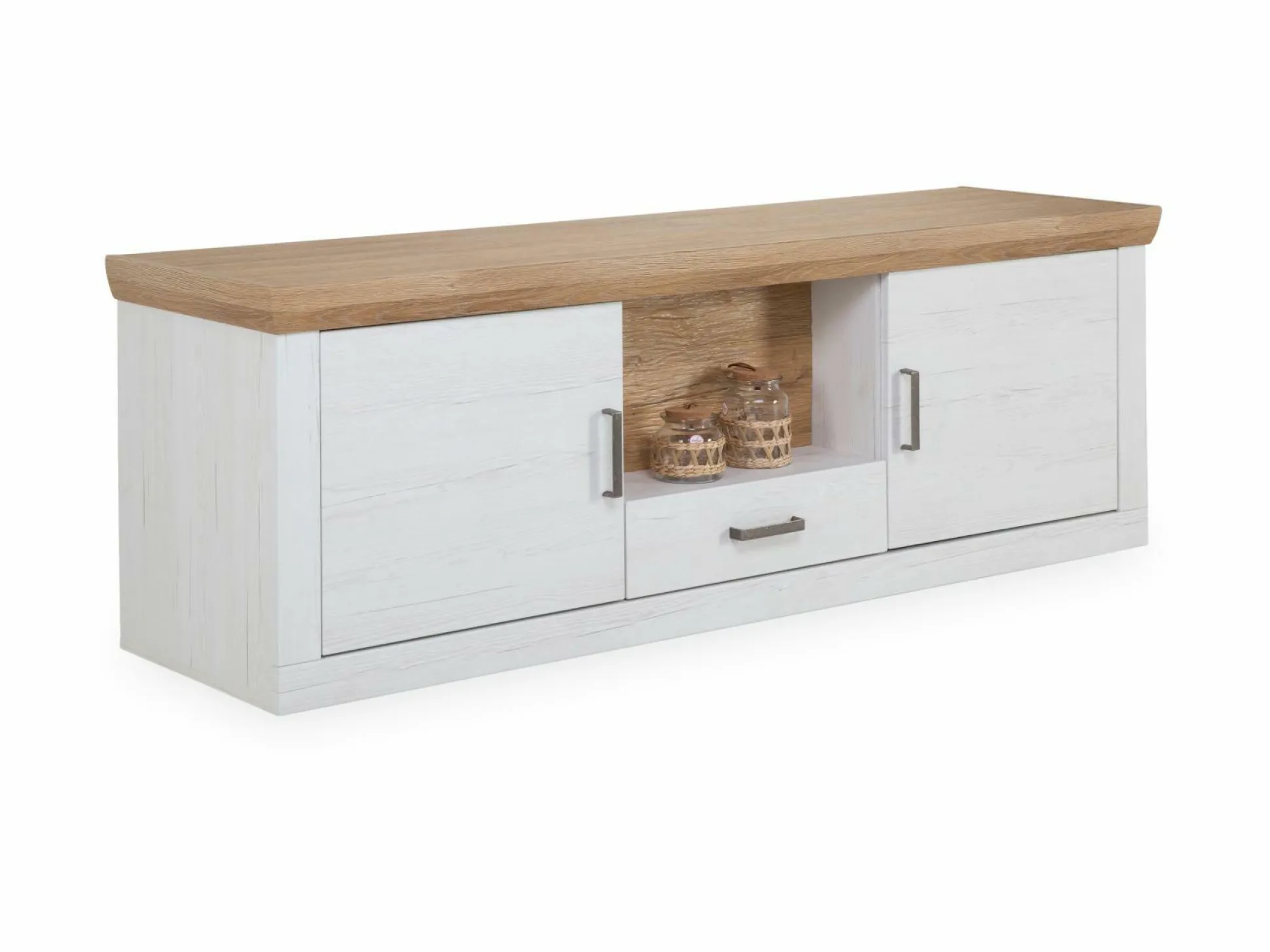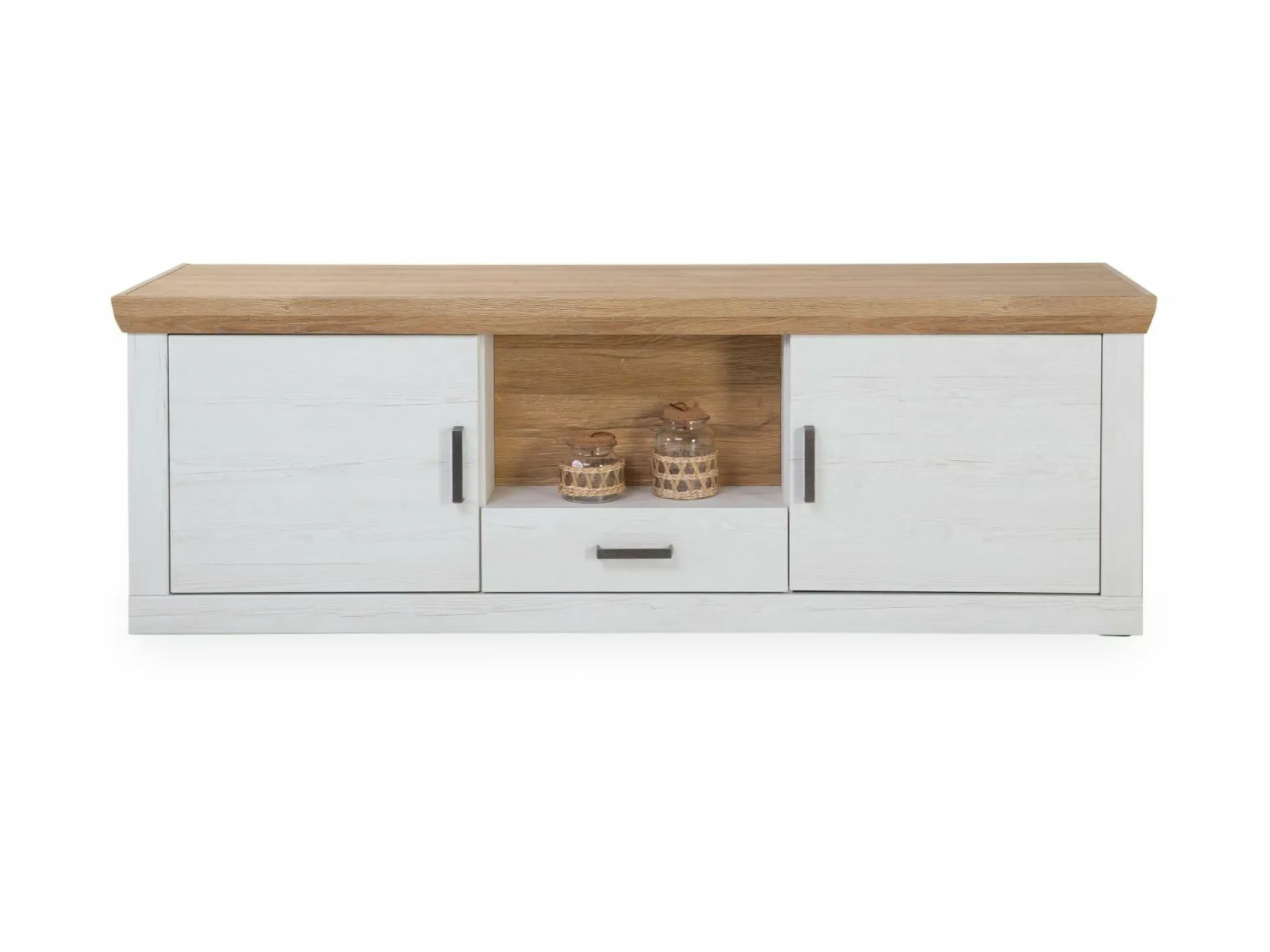 · 2 Türen (links und rechts), 1 Schublade und 1 offenes Fach