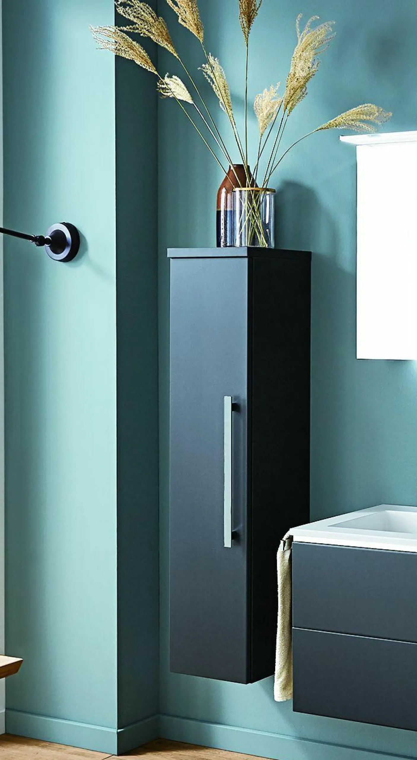Schaffen Sie Platz und Ordnung in Ihrem Badezimmer mit den Midischrank KB San Francisco aus dem Hause puris. Das moderne Design ist ein absoluter Hingucker und wird Ihr Bad perfekt ergänzen. Der Schrank, sowie die Abdeckplatte sind in einem schicken Cosmo grey gehalten und werden von einem Stangengriff in Chrom ergänzt. Die vier Glasböden halten dabei ausreichend Stauraum für Ihre Utensilien bereit.