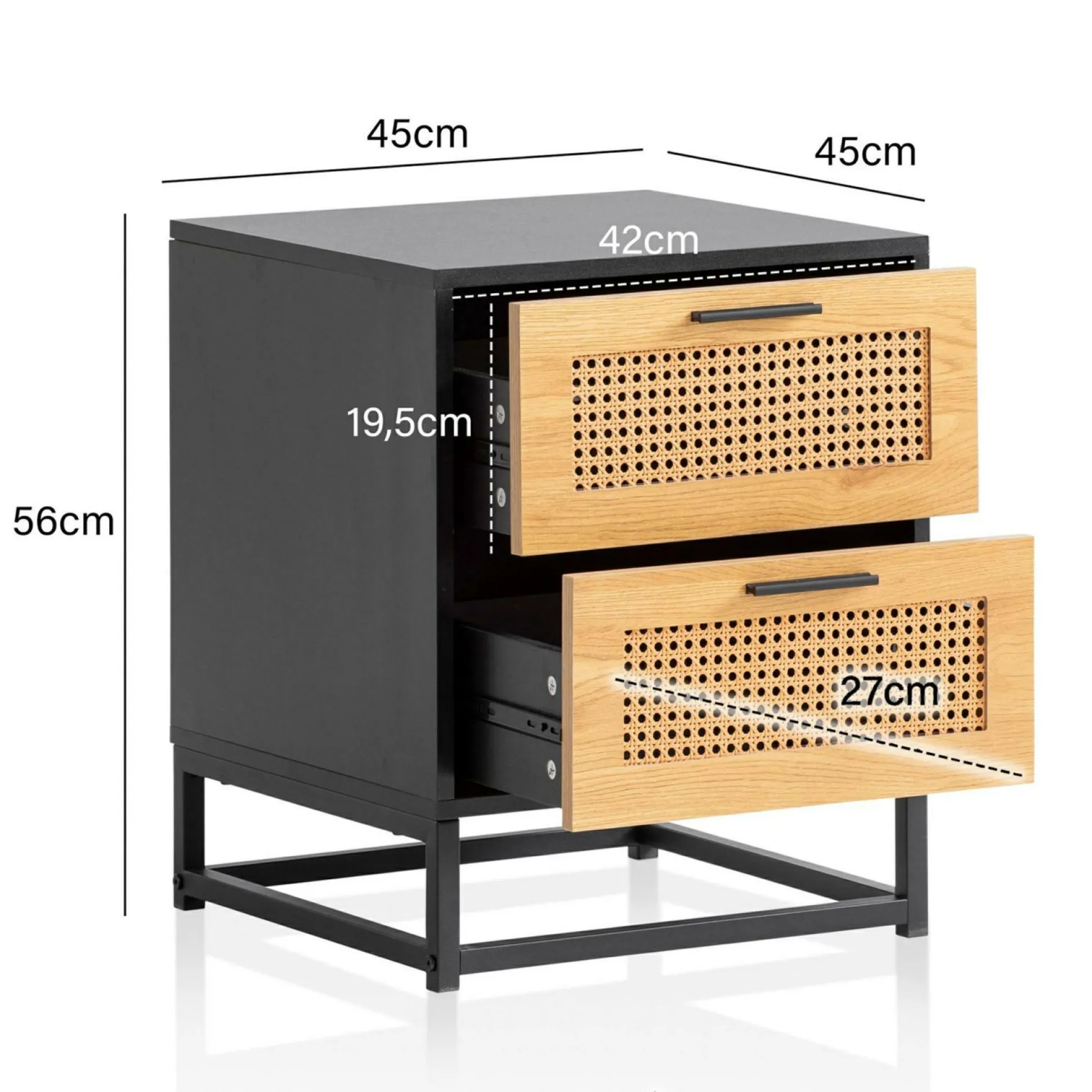 · Abmessungen – Breite: 45 cm // Tiefe: 45 cm // Höhe: 56 cm // Innenmaße Schublade (BxHxT): 39 x 18 x 27 cm // Holzstärke: ca. 1,5 cm.