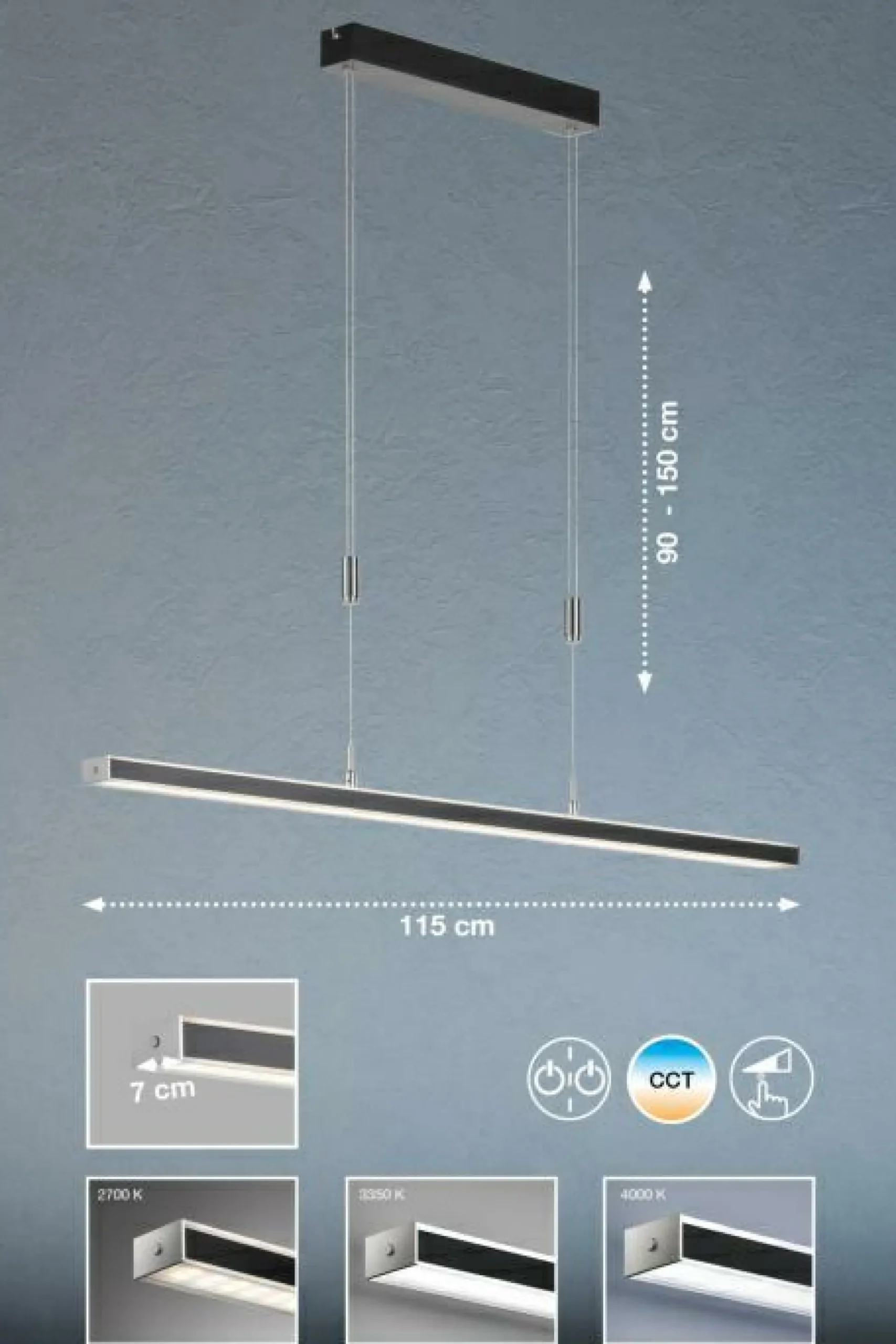 Holen Sie sich mit dieser formschönen Pendelleuchte Behaglichkeit und optimale Beleuchtung in Ihr Zuhause. Alle Qualitäten und Besonderheiten, die die Marke FISCHER & HONSEL prägen, werden in der Hängelampe zusammengeführt. Eine Option zum Dimmen ermöglicht eine optimale Anpassung der Helligkeit. Durch ihr hübsches Aussehen vervollständigt die Lampe das Beleuchtungskonzept jeglicher Bereiche auf stilvolle Art und Weise. Sie verfügt über eine FEST-Fassung. Die Hängeleuchte besitzt ein Längenmaß von 115 cm und ist insgesamt 7 cm breit. Sie punktet mit der Qualität des verwendeten Metalls. Die hervorragende Innenlampe stellt eine harmonische Beleuchtung sowie eine behagliche Atmosphäre her und ist eine Bereicherung für Ihre Einrichtung. Um das Design Ihrer Wohnräume stimmig abzurunden, eignet sich die Innenlampe optimal. Durch die attraktive Lichtwirkung der Innenlampe wird eine heimelige Atmosphäre zum Wohlfühlen erzeugt.