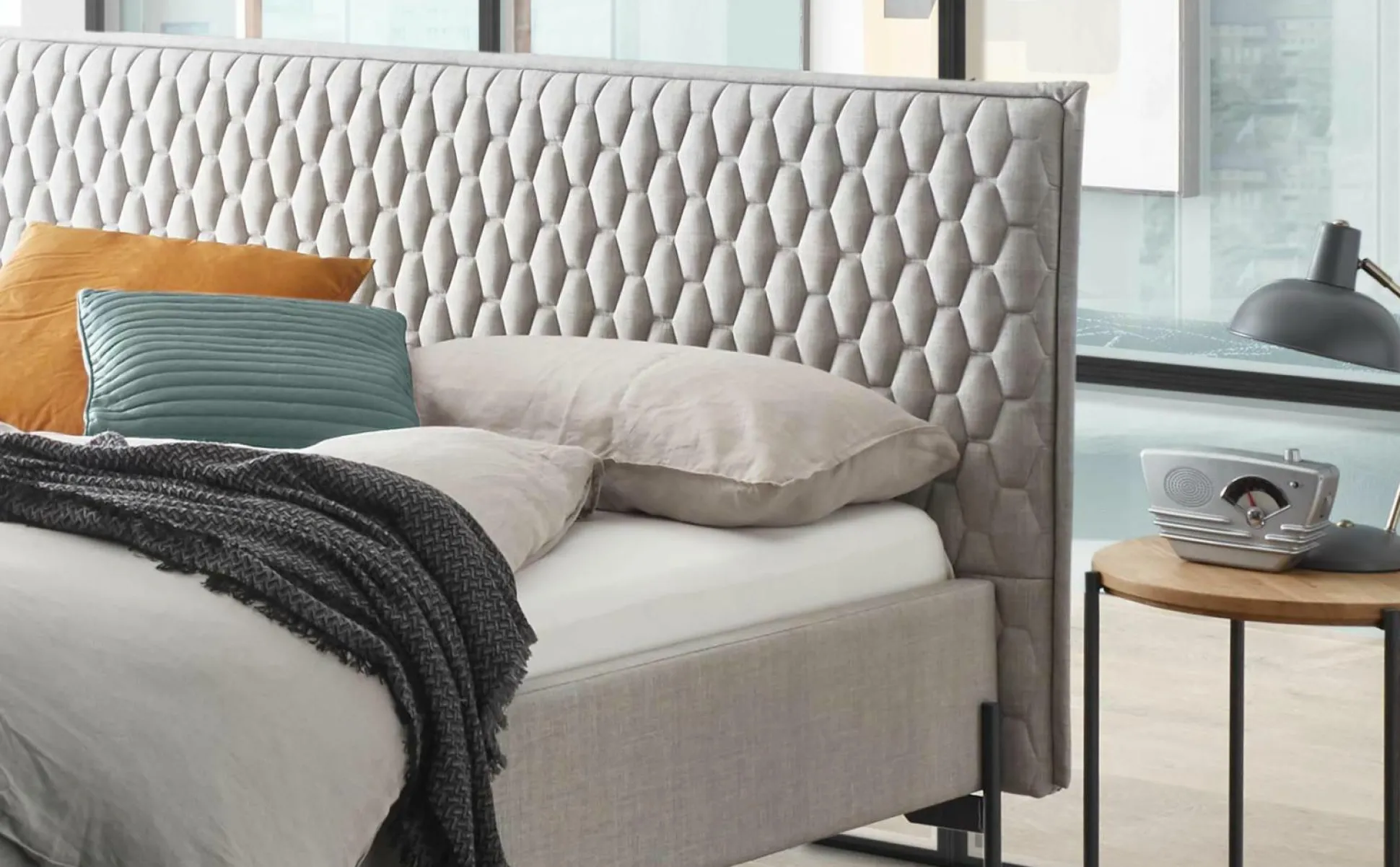 · Bella Italia ? unser Bett Gloria vereint die besten Eigenschaften des zeitgenössischen italienischen Stils wie funktional, hochwertig und schick. Dieses Modell besticht durch seine zarte, geradlinige Eleganz. Die leinenartige Anmutung des Gewebes mit raffinierter Steppung beim Kopfteil und den filigranen Füssen wirken sommerlich leicht wie eine frische Brise an der Costa Amalfi.