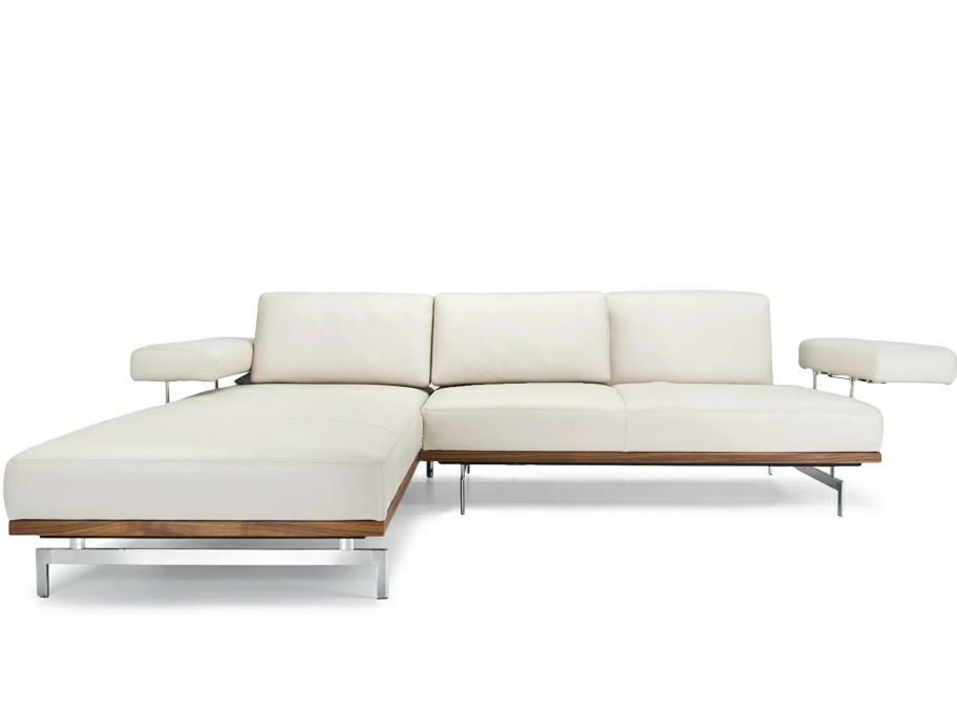 Das stilvolle Ecksofa mit hellem Echt Leder Bezug entspricht einem modernen Stil, der durch Nussbaum Holz ergänzt wird. Die Kufe aus hochglänzend poliertem Aluminium ergänzt das schicke Design. Die optisch ansprechende Polsterecke ist auch am Rücken echt bezogen. Somit ist die Positionierung im Raum möglich.