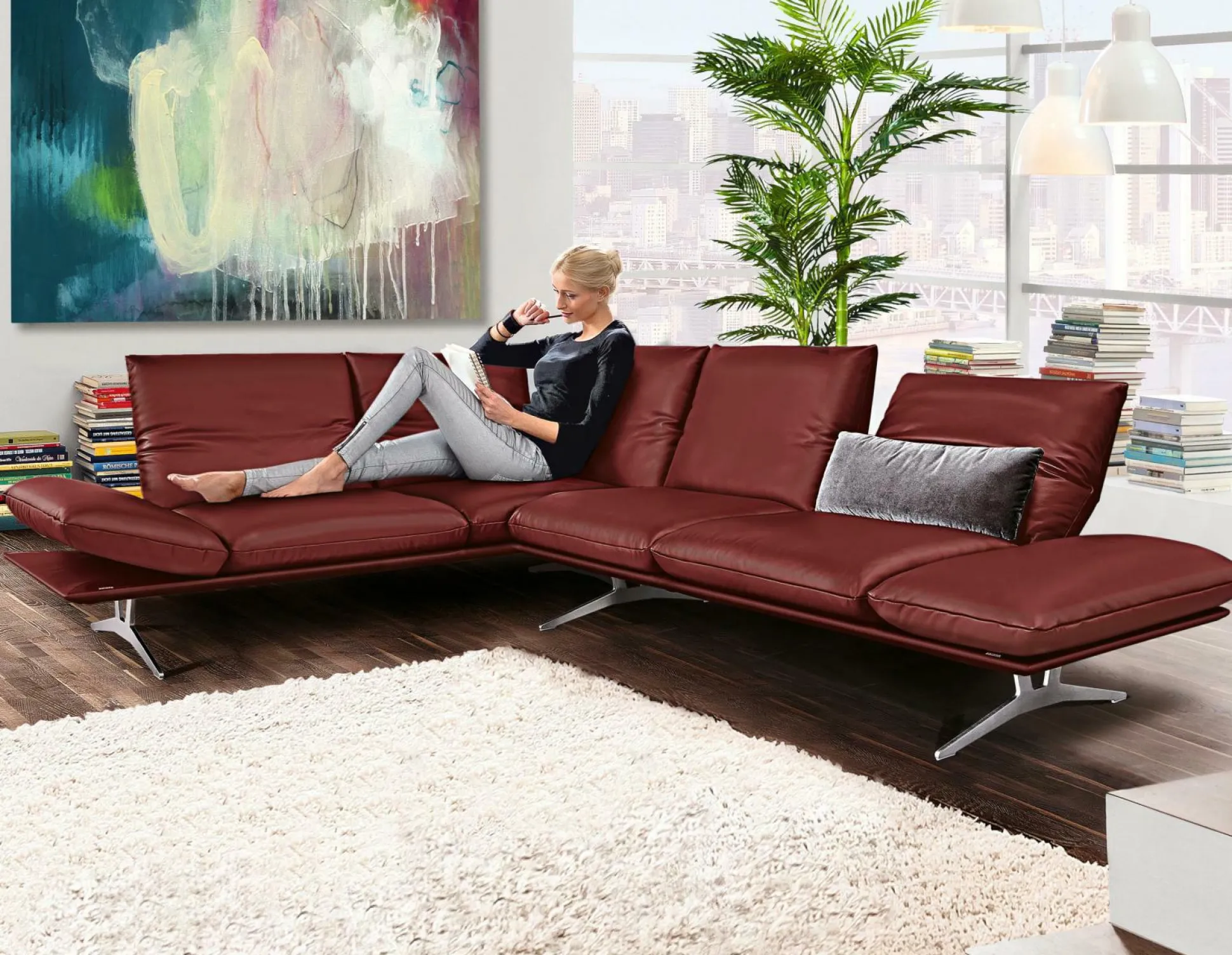 Schaffen Sie eine edle Sitzgelegenheit in Ihrem Wohnraum mit der Polsterecke 1136 Francis. Diese hochwertige Polsterecke ist mit Leder der Farbgebung Granata bezogen und bietet eine stilvolle Optik. Die Polsterecke besteht aus einem 2,5-sitzigen Element sowie einer Anbauecke, wodurch mehrere Personen einen komfortablen Platz finden. Die besonders legere Polsterung lädt zum Entspannen ein, während die satinierten Kufen stabilen Halt bieten. Der Rücken ist echt bezogen, sodass ein freies Aufstellen im Raum möglich ist.