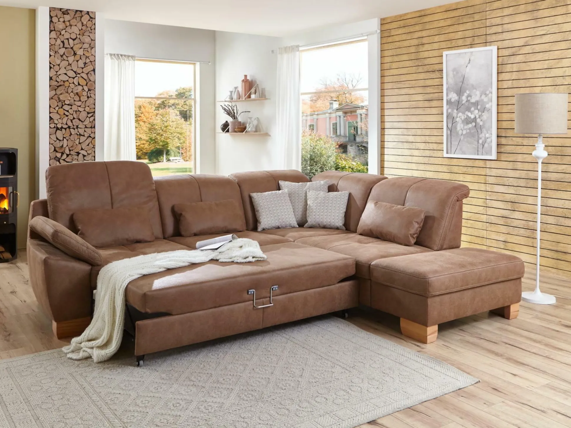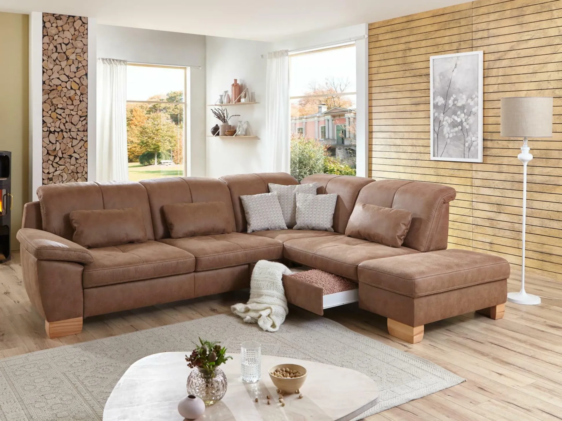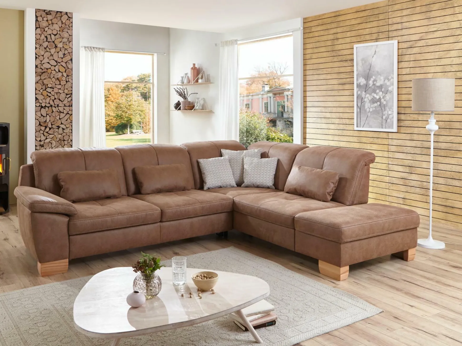 Valmondo präsentiert mit der Polsterecke Gianna eine hochwertige Entspannungsgelegenheit. Sie zeigt sich in der Farbe Tabac und besteht aus einem 3-Sitzer Sofa mit Armteil vorstehend links, einem Kombielement, einem 1,5-Sitzer und einem Anstellhocker vorstehend rechts. Zudem kommt die Polsterecke inklusive Kopfpolsterverstellung und Federkern im Sitz. Füße aus Kernbuche und ein echt bezogener Rücken runden das schlichte Design ab.