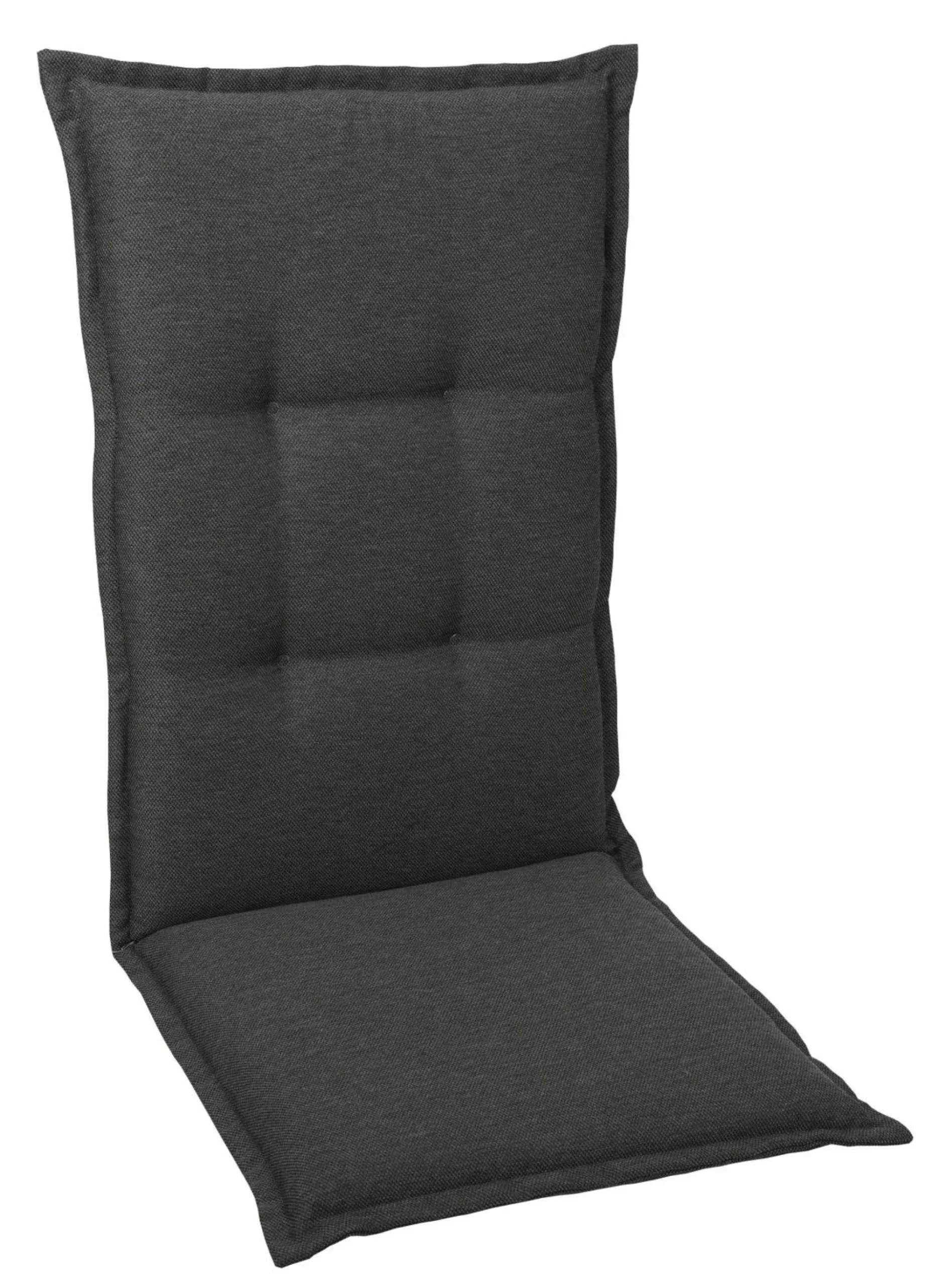 anthrazit Sesselauflage mit hochwertiger Schaum-/Vliesfüllung, verstellbarem Gurthalteband im Rücken, seitlichen Bindekordeln und Kreissteppungen im Lehnenrücken.
