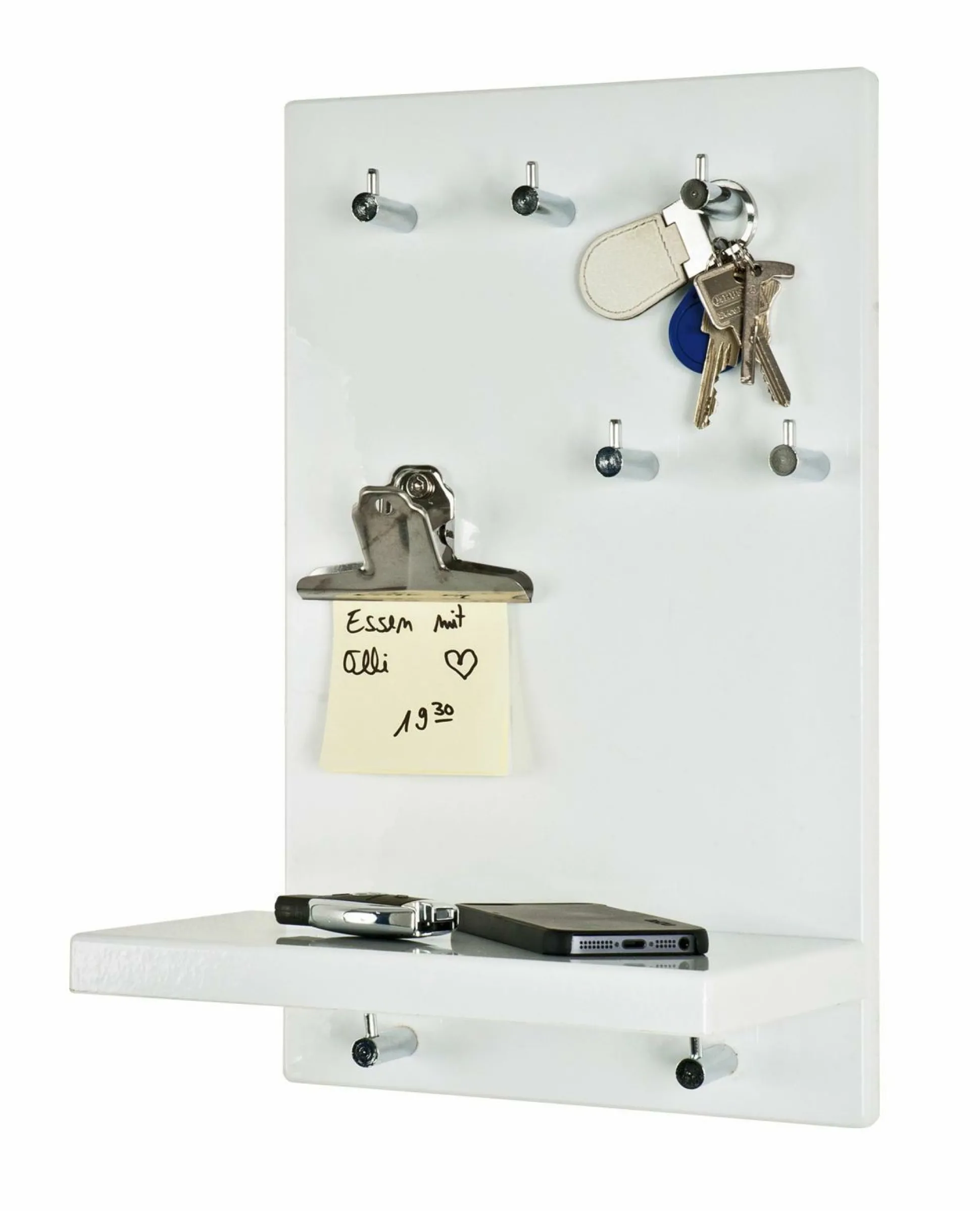 Ein Schlüsselboard darf in keinem Flur fehlen, denn hier können Sie schnell und einfach wichtige Dinge ablegen und haben alles direkt griffbereit. Dieses schicke Schlüsselboard besteht aus MDF Dekorhochglanz in Weiß. An den sieben Garderobenknöpfen aus chrom-vernickeltem Stahl können Sie Ihre Schlüssel aufhängen und haben somit alles auf einen Blick. Zusätzlich besitzt dieses Board noch eine kleine Ablage, die Sie zum Beispiel für Ihr Handy nutzen können. Für wichtige Notizen steht Ihnen eine Klammer zur Verfügung, an die Sie kleine Zettel klemmen können. Das Schlüsselboard ist einfach eine super praktische Hilfe im Alltag!