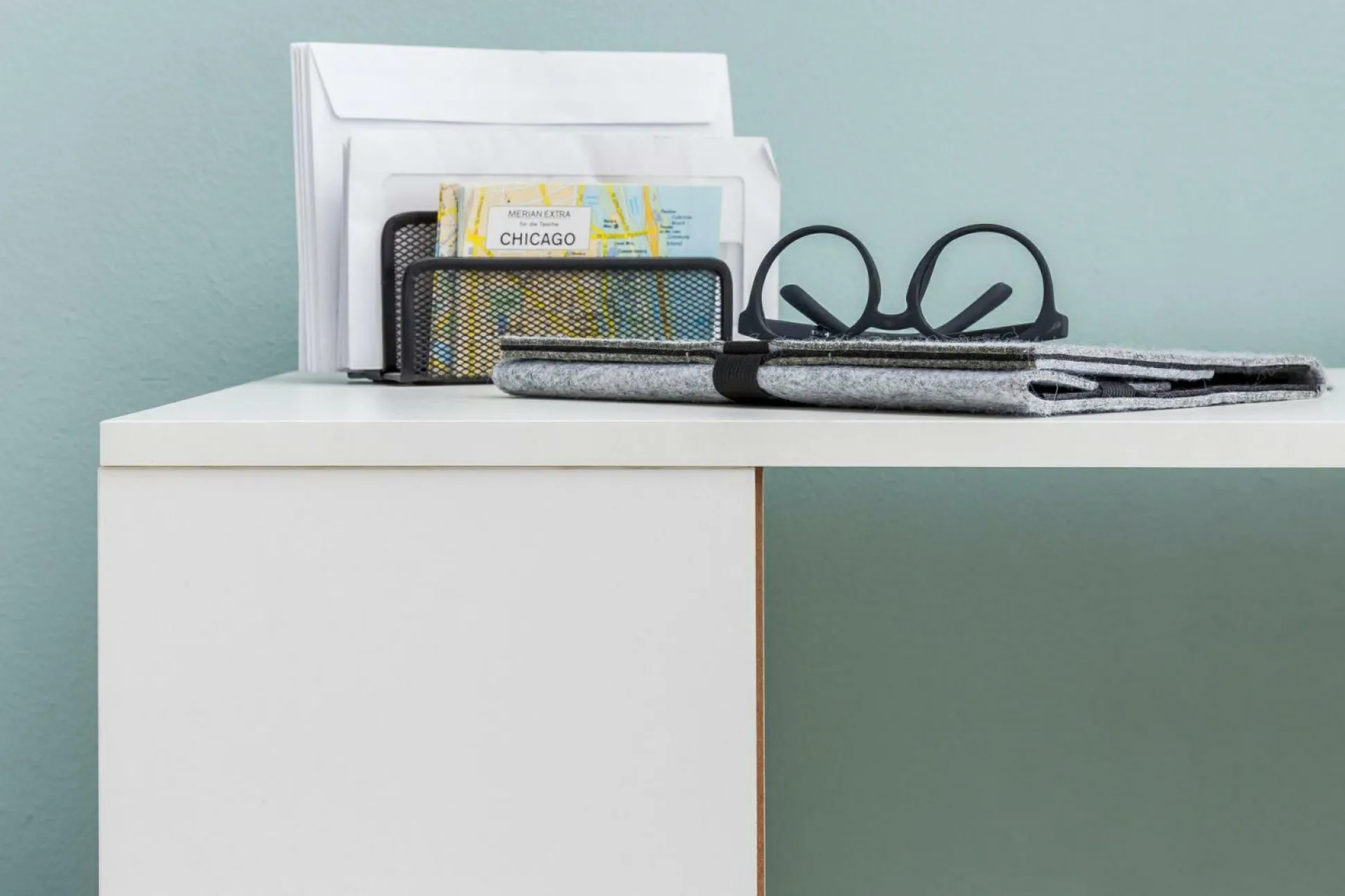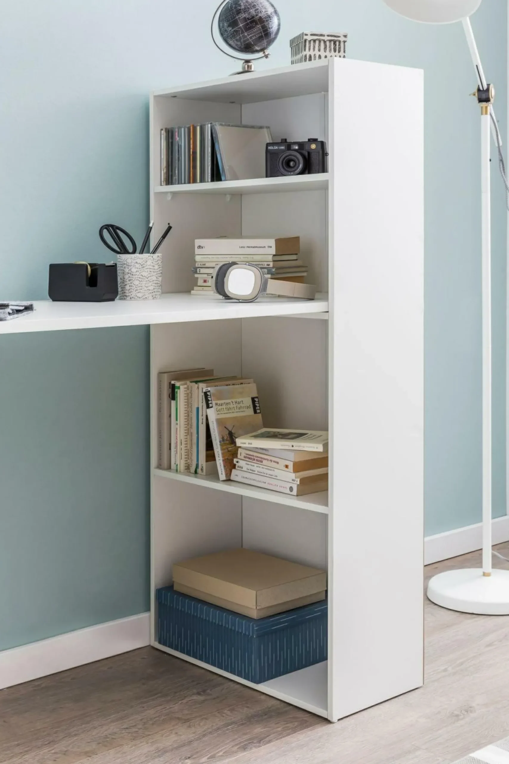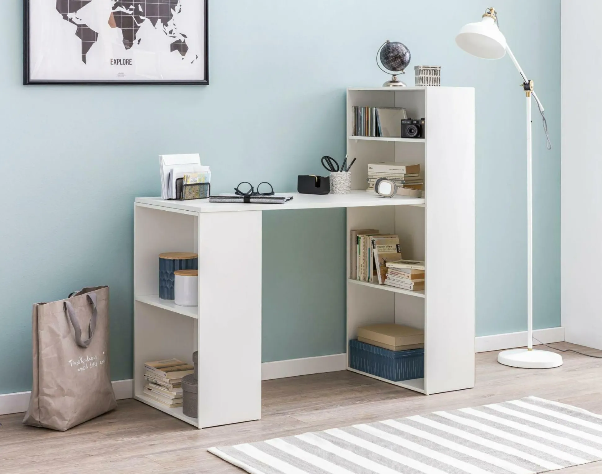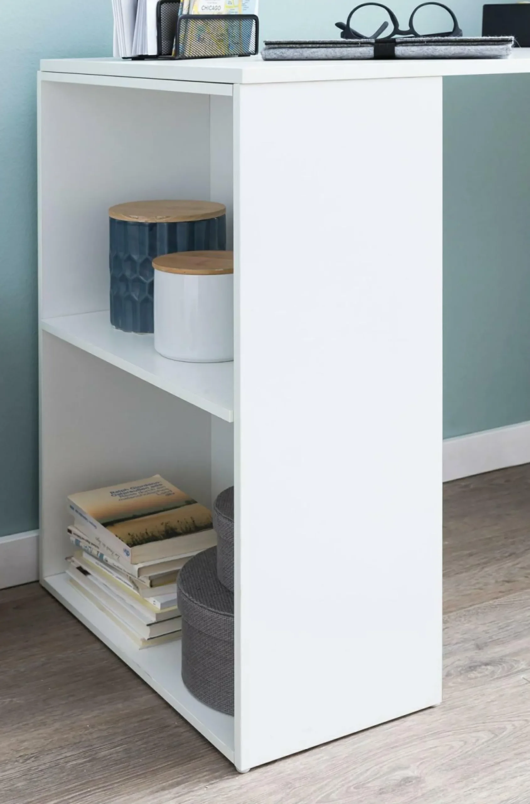 · Geschickt und platzsparend eingefädelt – Hier ist unser Arbeitstisch mit Regalkombination