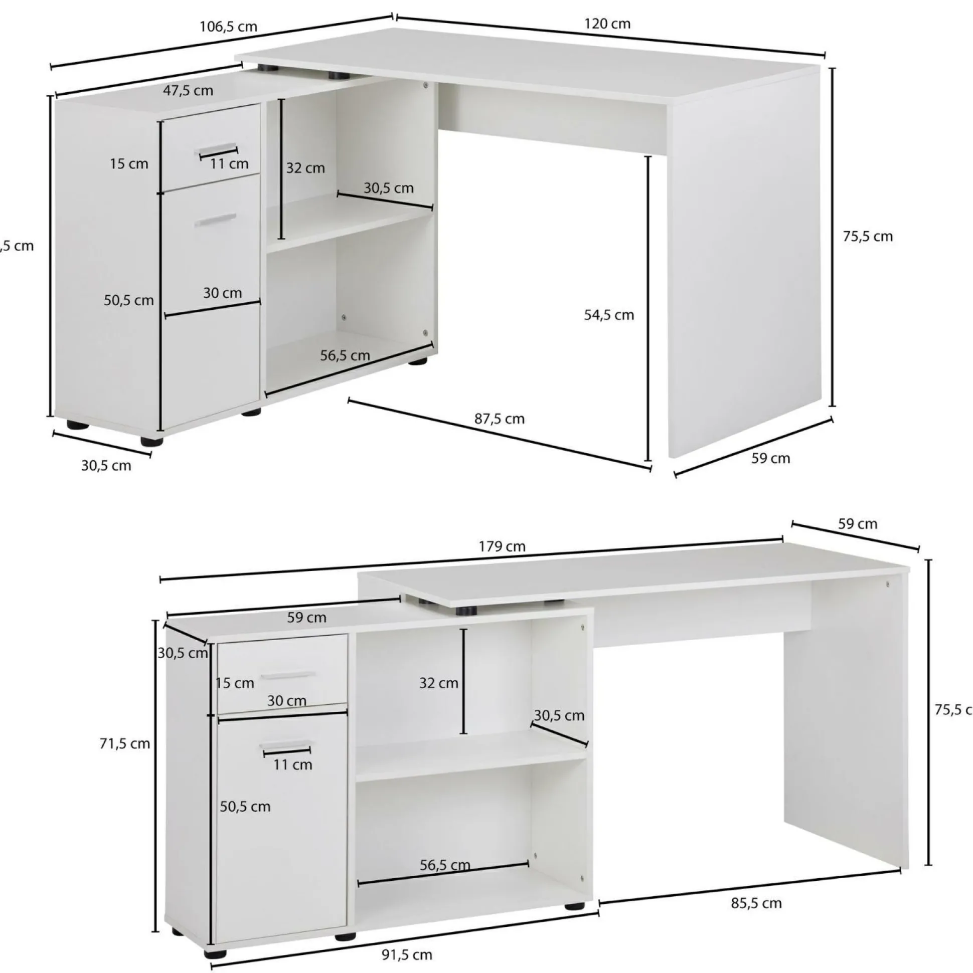 · Abmessungen – Boden bis Tischunterkante: ca. 74 cm, Innenmaße der Regalfächer (BxHxT): 56,5 x 32 x 30,5 cm.