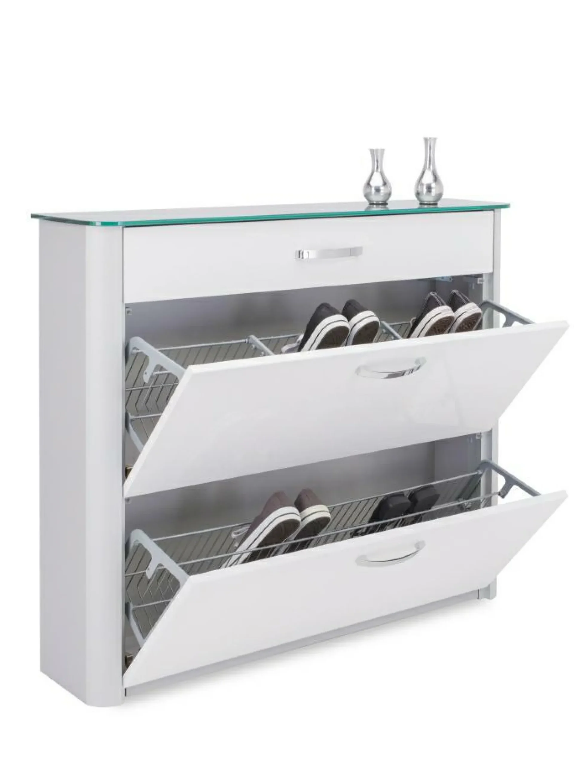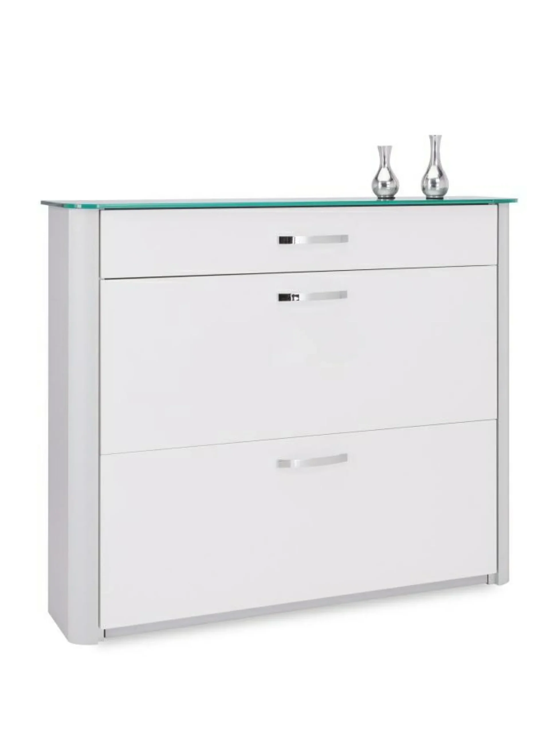Der Schrankabschluss ist von einer schicken Glasplatte bedeckt. Mit zwei großen Klappfächern und einem leichtgängigen Schubkasten ist in dem attraktiven Schuhkipper für optimal nutzbaren Stauraum gesorgt. Der Korpus ist aluminiumfarbig.