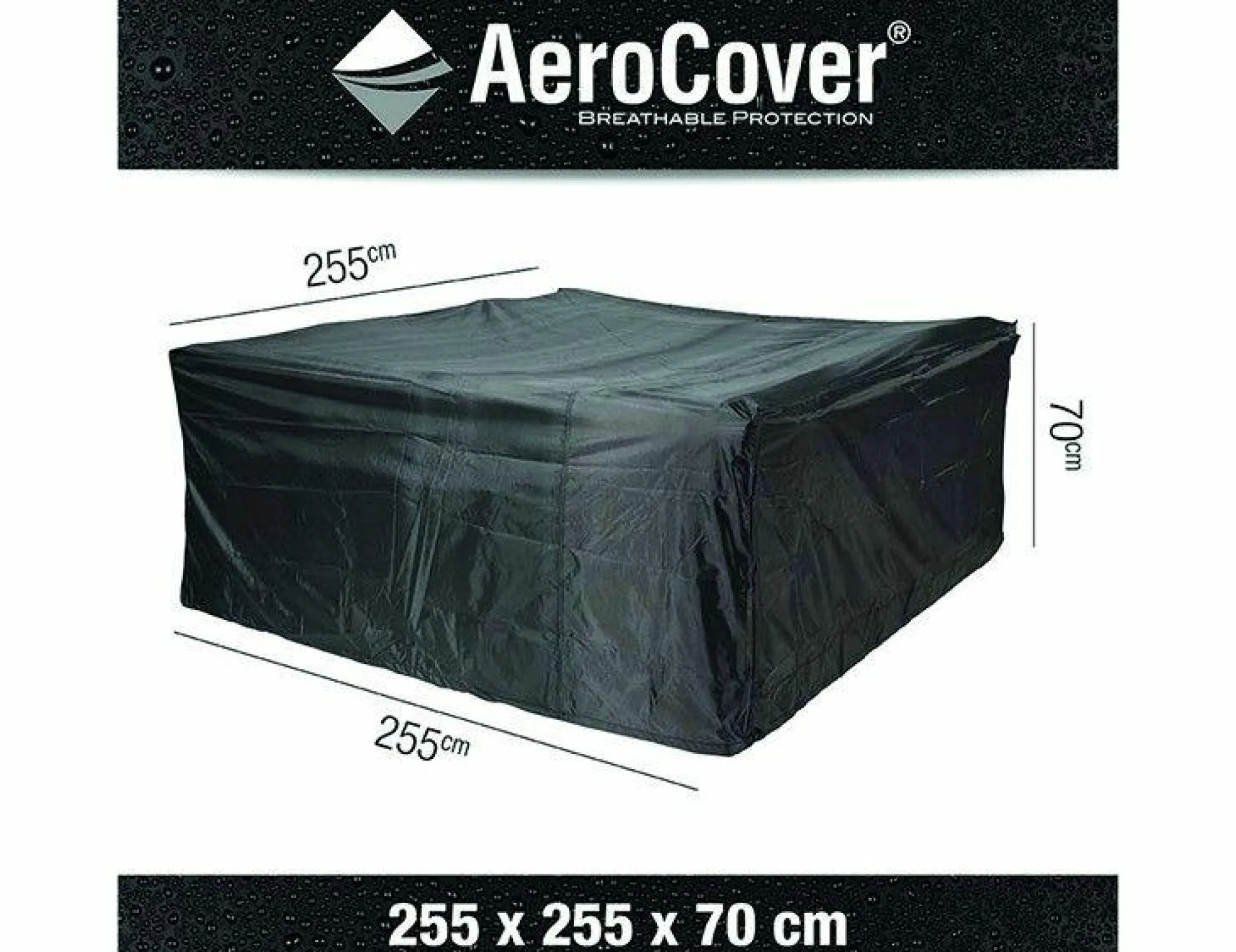 · Lounge-Set-Hülle von AeroCover. Atmungsaktive Lounge-Set-Hülle für Lounge-Sets 255x255xH70 cm aus mehreren Teilen, Ecksets mit hohem Tisch oder L-förmigen Sets, die zusammengeschoben werden. Das atmungsaktive AeroCover-Gewebe ist wasserbeständig und reduziert die Kondensbildung, wodurch der Bildung von Schimmel vorgebeugt wird. AeroCover Schutzhüllen verlängern die Lebensdauer Ihrer Gartenmöbel. AeroCovers sind aus leichtem Ripstop Polyester mit einer integrierten, atmungsaktiven Membran hergestellt. Dank des dünnen Gewebes sind diese Hüllen besonders handlich in der Anwendung. Bei Nichtgebrauch sind sie platzsparend aufzubewahren und nehmen, auch dank der integrierten Aufbewahrungstasche, sehr wenig Platz ein. Die Hülle ist mit einem Zugband mit zwei Stoppern ausgestattet, so dass eine optimale Befestigung sichergestellt ist. Das AeroCover-Gewebe ist 100% wasserdicht, die Nähte sind spritzwasserfest.