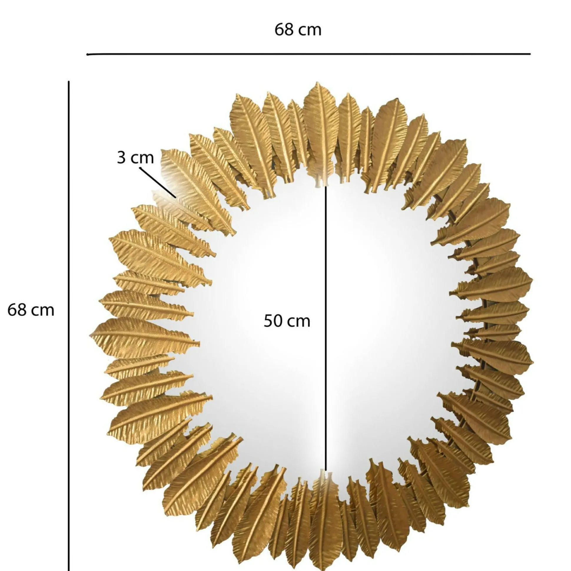 · Abmessungen – Breite: 68 cm // Höhe: 68 cm // Tiefe: 3 cm // Durchmesser Spiegel: 50 cm // Stärke der Spiegelfläche: 6 mm.