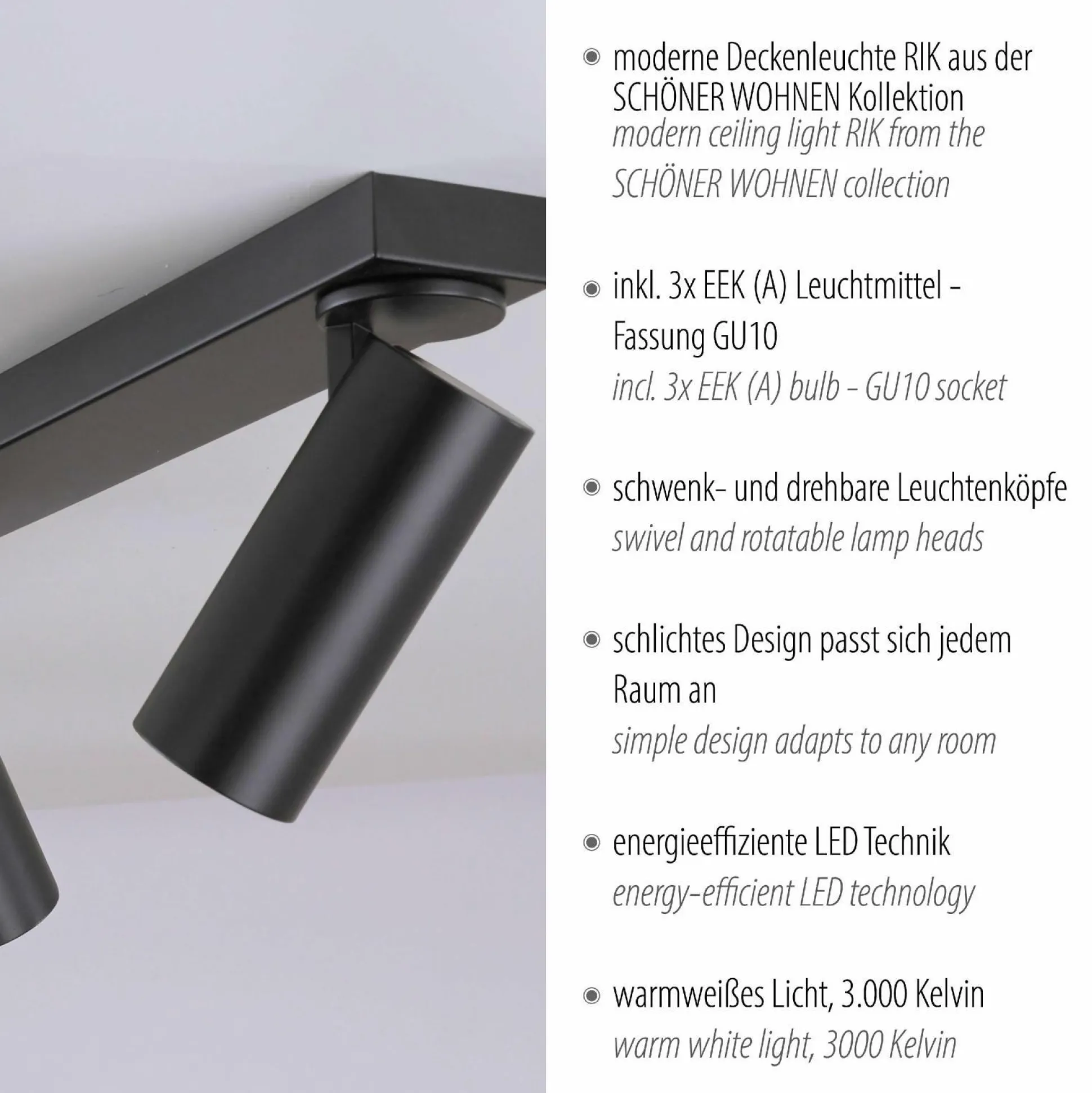 Mit der dekorativen Lampe SCHÖNER lässt sich eine schöne und praktische Beleuchtung auch in Ihren vier Wänden gekonnt einrichten. Die Leuchte zeigt sich in einem hervorragenden Design und fügt sich wundervoll in jedes Zimmer ein. Überzeugen Sie sich von der bewährten Qualität und der gelungenen Gestaltung der Marke SCHÖNER WOHNEN. Das Modell SCHÖNER hat eine Länge von 99 Zentimetern, eine Gesamtbreite von 25 Zentimetern sowie eine Höhe von 16,5 Zentimetern. Für die Fassung werden Leuchtmittel mit GU10-Sockel benötigt. Die Leuchte schafft ein persönliches Ambiente und setzt jeden Wohnraum besonders schön in Szene. Sie vervollständigt Ihr persönliches Einrichtungskonzept dank ihres skandinavischen Designs. Das Modell SCHÖNER wird Ihnen viel Freude bereiten und kann harmonisch in unterschiedliche Bereiche integriert werden. Kreieren Sie mit dieser Lampe ein Lichtkonzept, das restlos begeistert.