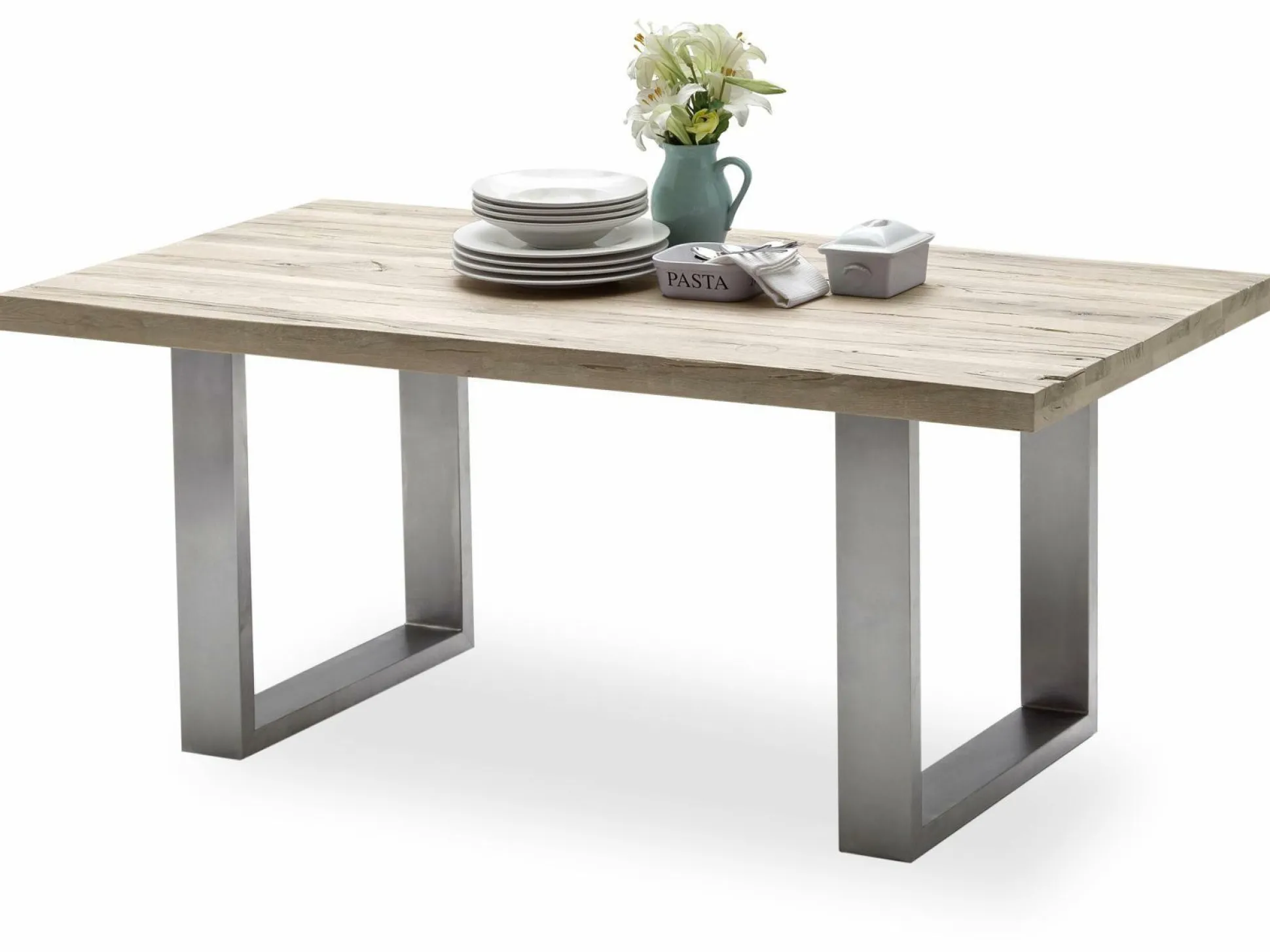 Der moderne Tisch CASTELLO der Trendmarke MCA vereint ein exklusives, rustikales Design mit hochwertigsten Materialien. Die 60 mm starke Tischplatte ist aus massiver Zerreiche gefertigt. Natürliche Gebrauchsspuren verleihen dem Holz einen besonderen Vintage Charakter. Die auffälligen Metallkufen sind aus 40 mm starkem und 120 mm breitem, gebürstetem Edelstahl gefertigt und harmonieren ansprechend mit dem kühlen Holzton. Der Tisch wird in jedem Einrichtungskonzept zum Hingucker und bietet großzügigen Platz für gemeinsame Mahlzeiten mit Ihren Liebsten. Die Flächenbelastung liegt bei 90 kg.