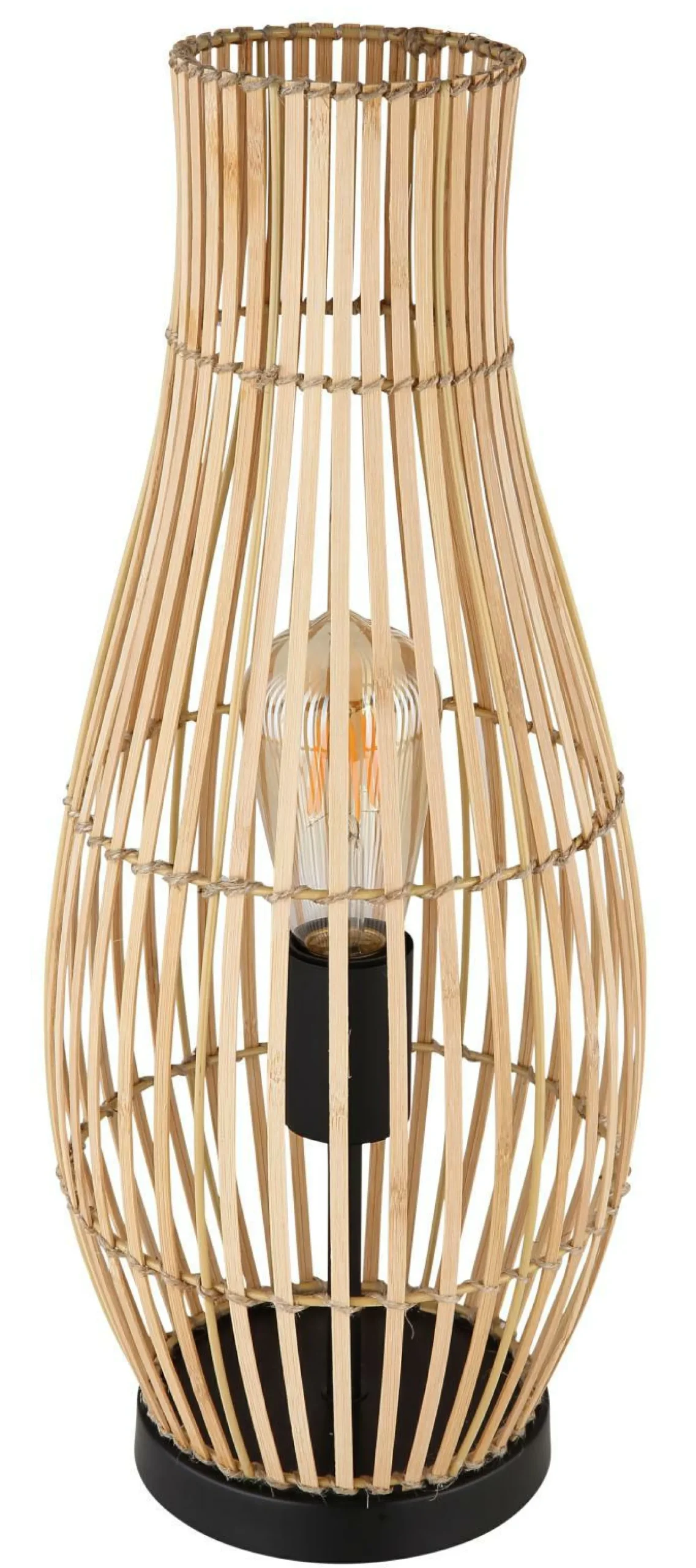 · Diese tolle Tischleuchte begeistert durch die Materialien Bambus und Hanf. Aus einem runden Sockel in Schwarz verläuft ein ovaler Schirm aus Bambus und Hanf ca. 48 cm in diese Höhe. Eine E27 Fassung befindet sich im Inneren des Bambusschirms und ermöglicht Ihnen bis zu einer maximalen Leistung von 60 Watt selbst über Lichtfarbe und Helligkeit zu bestimmen. Aufgrund von Langlebigkeit und Stromersparnis empfehlen wir Ihnen LED-Leuchtmittel.