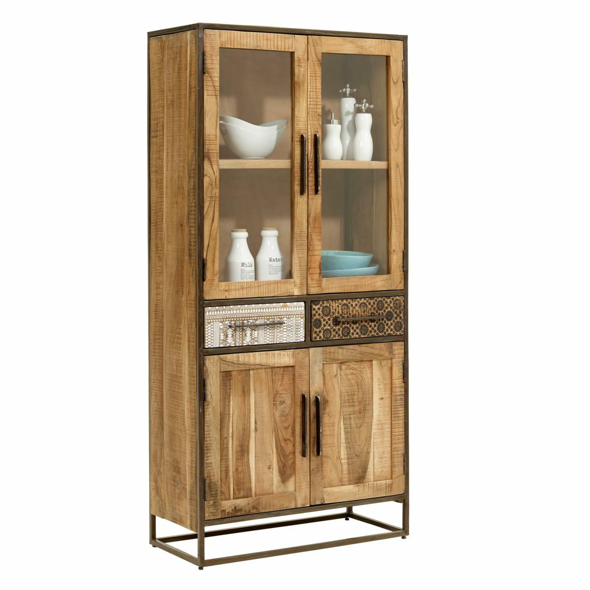 Bereichern Sie Ihren Wohnraum mit der Vitrine Wake Up von Wolfmöbel. Dieses hochwertige Element ist aus massiver Akazie gefertigt und bringt einen rustikalen Charme in Ihre vier Wände. Darüber hinaus sorgen die schwarzen Metallrahmen für einen attraktiven Kontrast. Neben einer angenehmen Optik mit rauer Oberfläche und hellbrauner Holzfarbe bietet diese Vitrine mit zwei Glas- und zwei Holztüren sowie zwei Schubladen mit schönem Print reichlich Stauraummöglichkeiten. Naturfarbene Metallgriffe runden den Look ab und erleichtern die Bedienung.