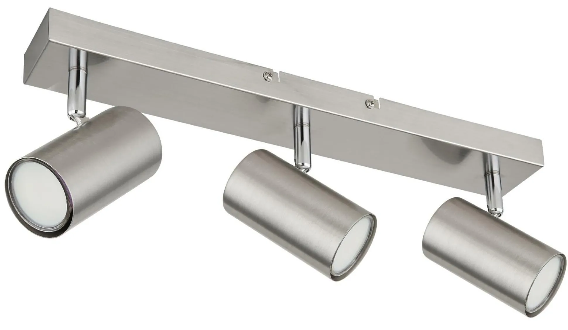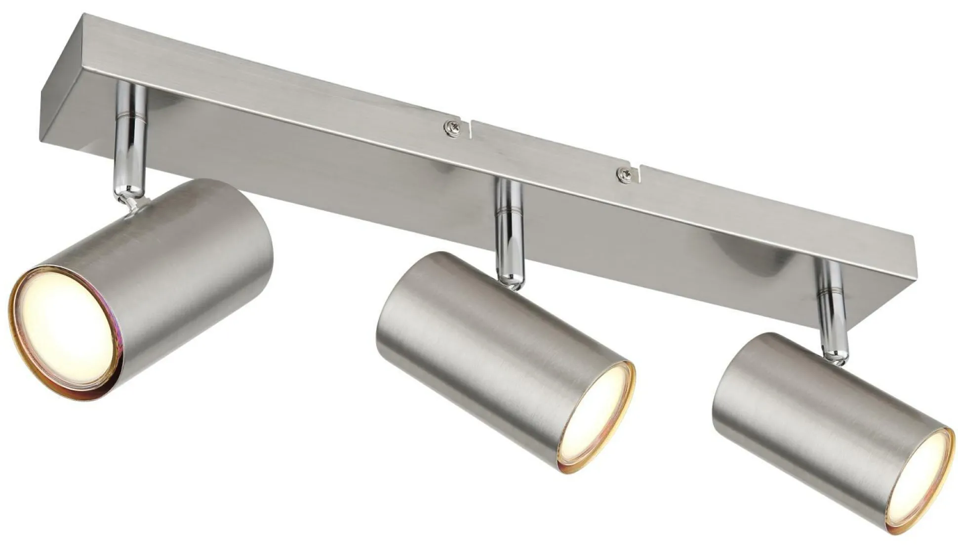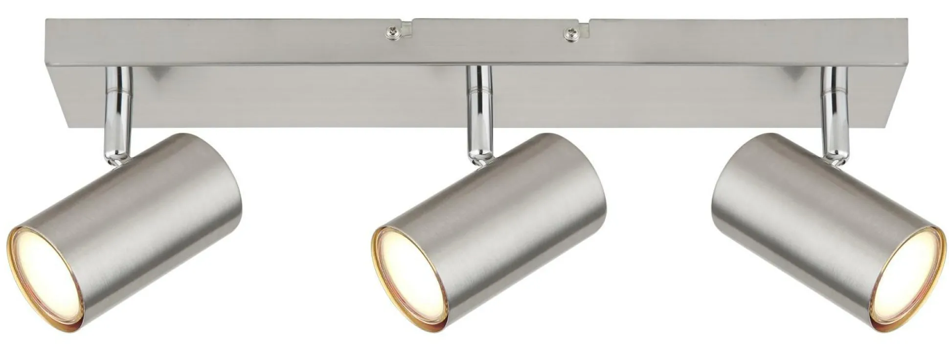 · Dieser schlichte Strahler der Robby Serie begeistert durch Design und Farbgebung. An einer rechteckigen Deckenhalterung (41x6cm) befinden sich drei GU10 Fassungen, bedeckt von jeweils einem zylinderförmigen Schirm in matten Nickel. Die GU10 Fassung, ermöglicht Ihnen die freie Wahl an Leuchtmitteln, bis zu einer maximalen Leistung von 35 Watt.