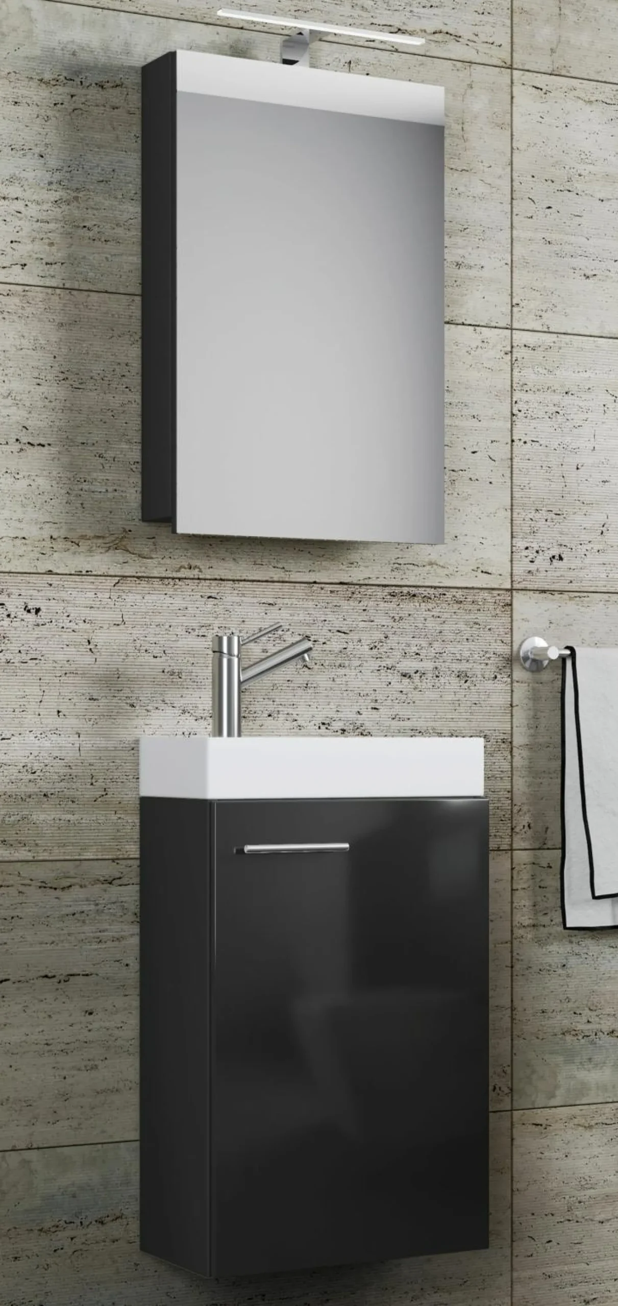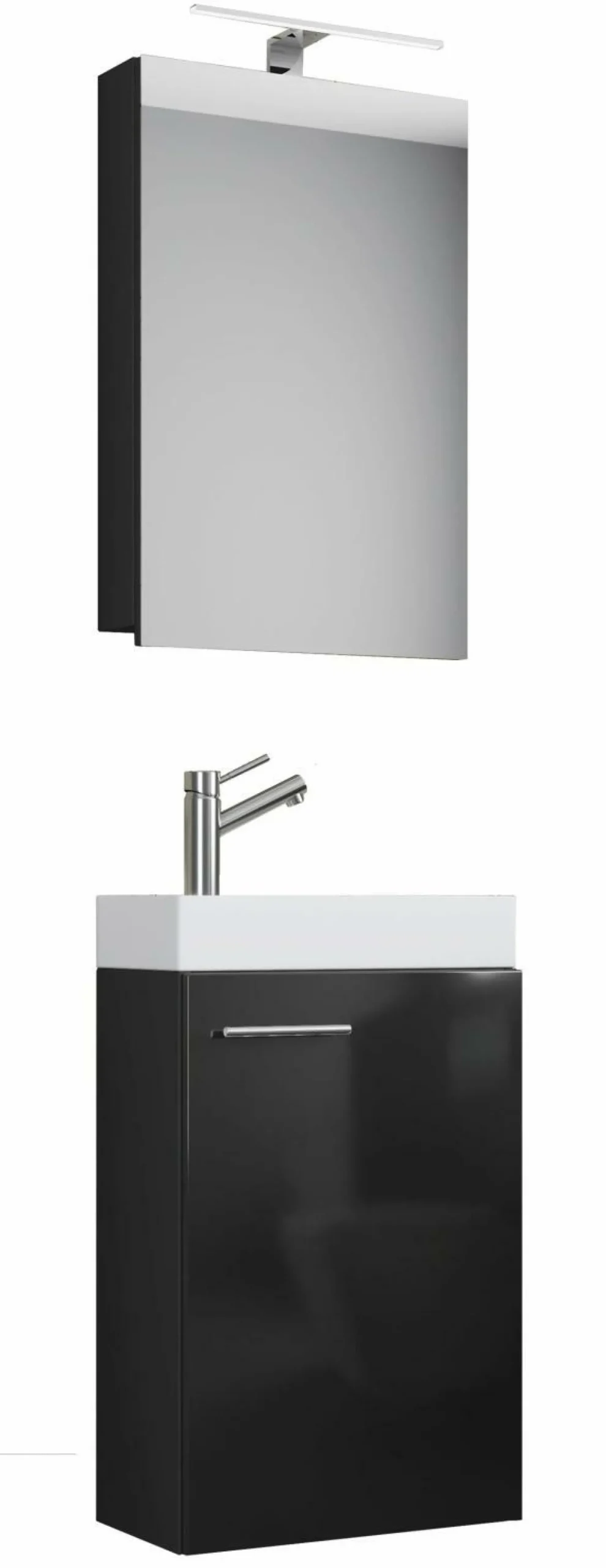 · Das moderne Bad-Set Slito mit Spiegelschrank eignet sich für ein Gäste-WC oder kleines Bad.