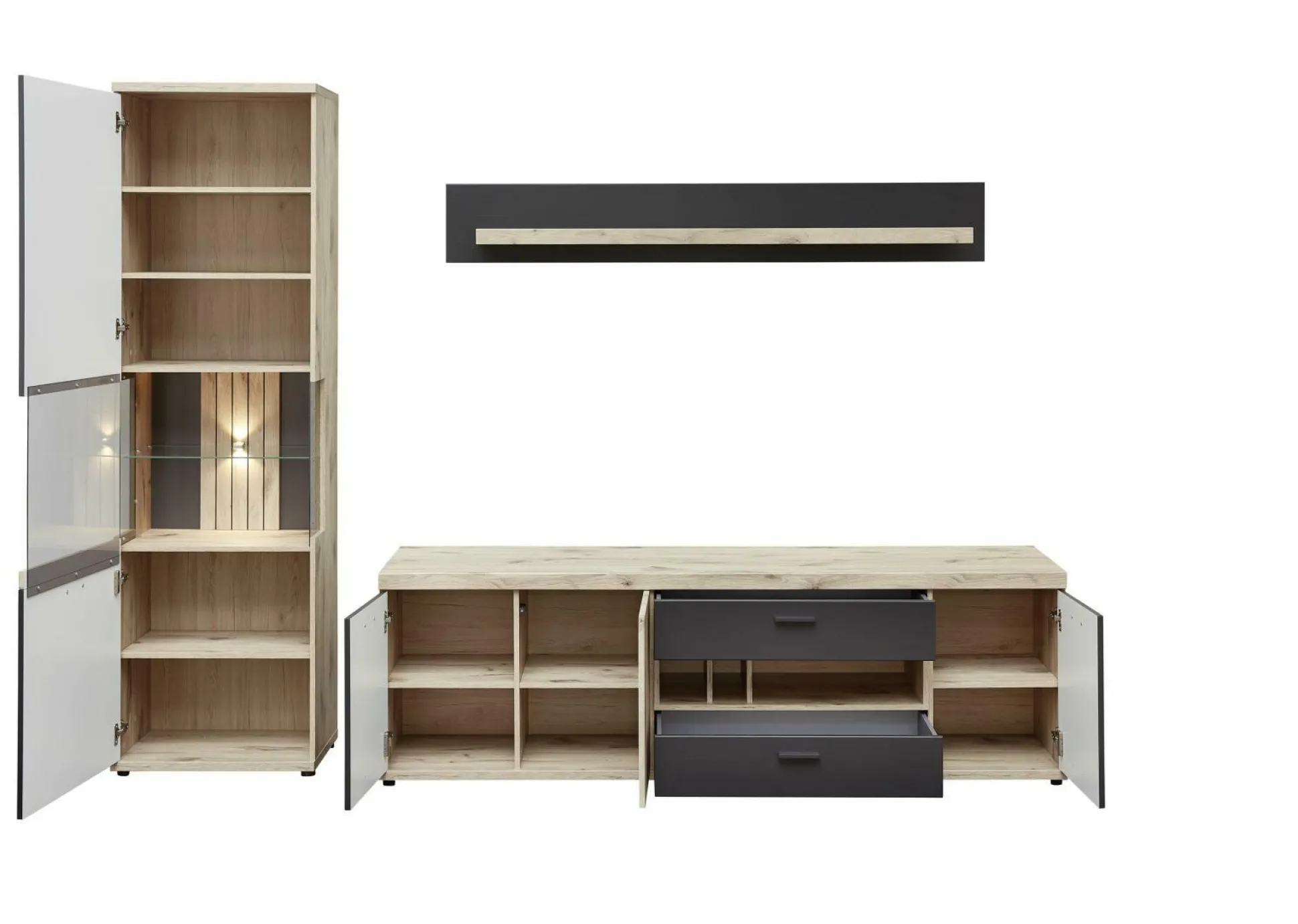 · Bestehend aus: Vitrine mit 1 Tür links, Wandbord und Lowboard mit 3 Türen, 2 Schub- kästen und 3 offenen Fächern