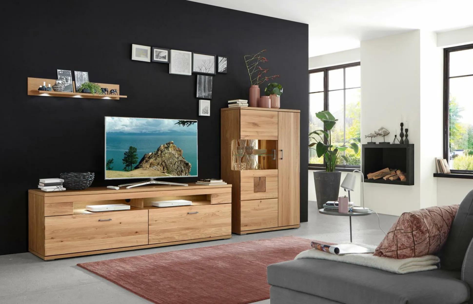 Für eine ansprechende Optik in Ihrem Wohnbereich sorgt die Wohnwand Ivaris. Dabei bestehen ihr Korpus aus einer Nachbildung von Alteiche und ihre Front aus massiv geölter Alteiche. Frontakzente werden in Alteiche Hirnholz gesetzt und die sichtbaren Rückwände präsentieren sich in sandgestrahlter Eiche. Die Vitrine ist aus Parsolglas angefertigt und besitzt Schubkästen mit Selbsteinzug. Zu der Wohnwand gehören ein Lowboard (BHT 165/57/50 cm), ein Highboard und ein Wandboard (BHT 160/24/26 cm). Mit dieser Wohnwand ist für ausreichend Stauraum gesorgt und auch Ihre Lieblingselemente lassen sich in der Vitrine gekonnt in Szene setzen. Auf Wunsch können Sie eine passende Beleuchtung hinzu bestellen.