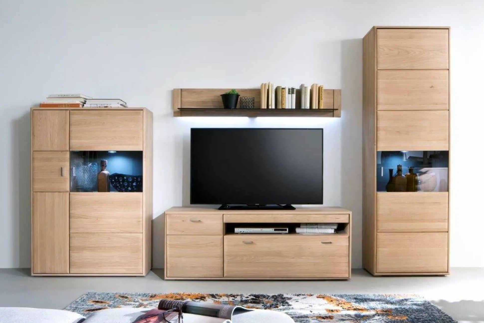 Front: Eiche Bianco massiv geölt Korpus: außen Eiche Bianco furniert / innen Eiche Bianco Nachbildung Glas in Parsol grau Rückwand hinter Glas: taupefarbig Dekor Schubkästen und Glastüren gedämpft Wohnwand best. aus: Vitrine, Lowboard, Highboard und Wandboard >>> Preis ohne Beleuchtung <<>> Maße ca. Montagemaße <<<