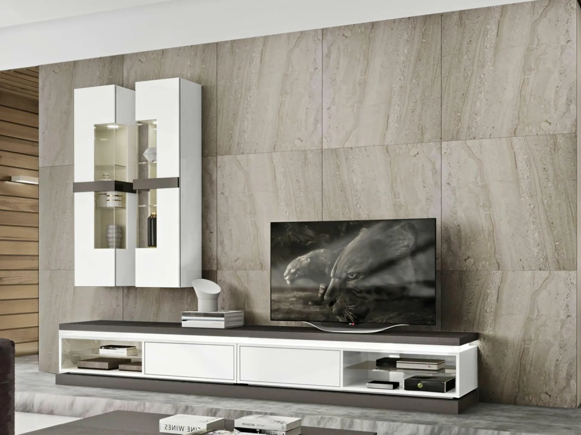 · 1x Lowboard, mit einem offenen Fach vorstehend links, einer Schublade und einem Glasboden