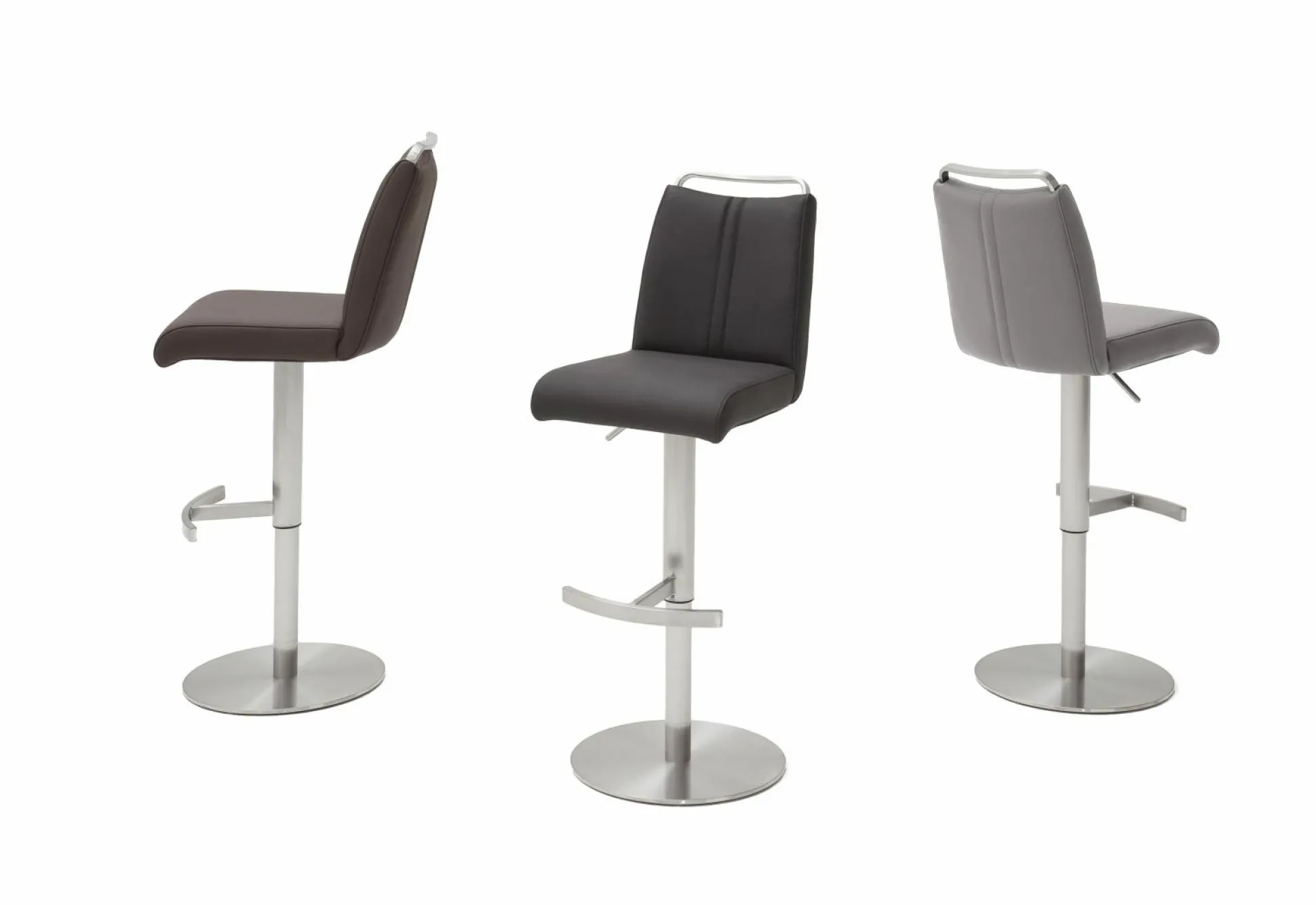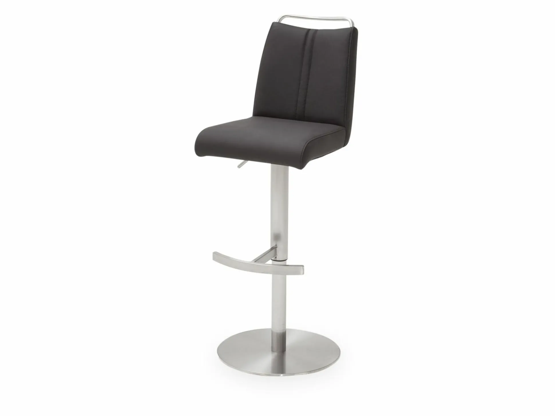 Der Barstuhl verfügt über einen anthrazitfarbigen Lederbezug und ein elegantes Edelstahlgestell. Der in die Rückenlehne eingearbeiteter Griff ermöglicht nicht nur eine einfachere Handhabung des Stuhls, er ist zudem ein dekorativer Akzent.