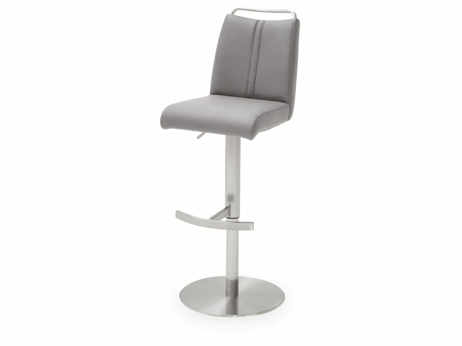 Der Barstuhl verfügt über einen eisgrauen Lederbezug und ein elegantes Edelstahlgestell. Der in die Rückenlehne eingearbeiteter Griff ermöglicht nicht nur eine einfachere Handhabung des Stuhls, er ist zudem ein dekorativer Akzent.