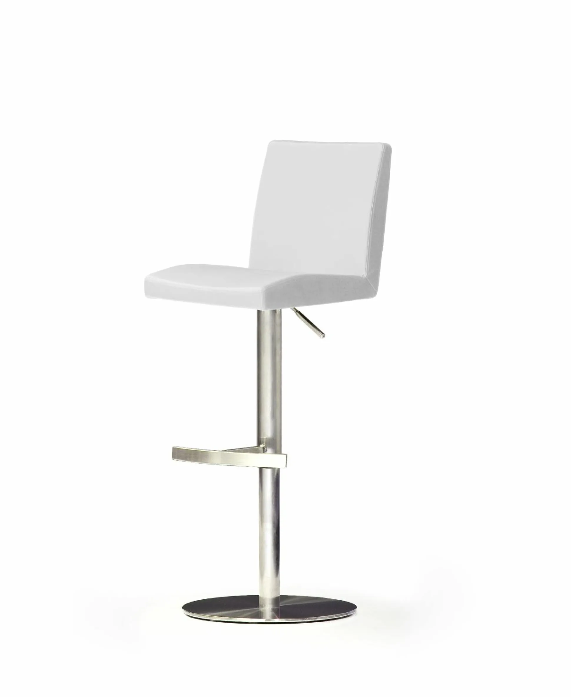 Top modern und höchst bequem präsentiert sich der Barhocker in einem weißen Lederlook. Der Barstuhl mit einem runden Edelstahlgestell lässt sich in der Höhe zwischen 85 und 110 cm verstellen. Ein Tellerfuß und eine Fußstütze rundet das attraktive Design des Hockers ab.