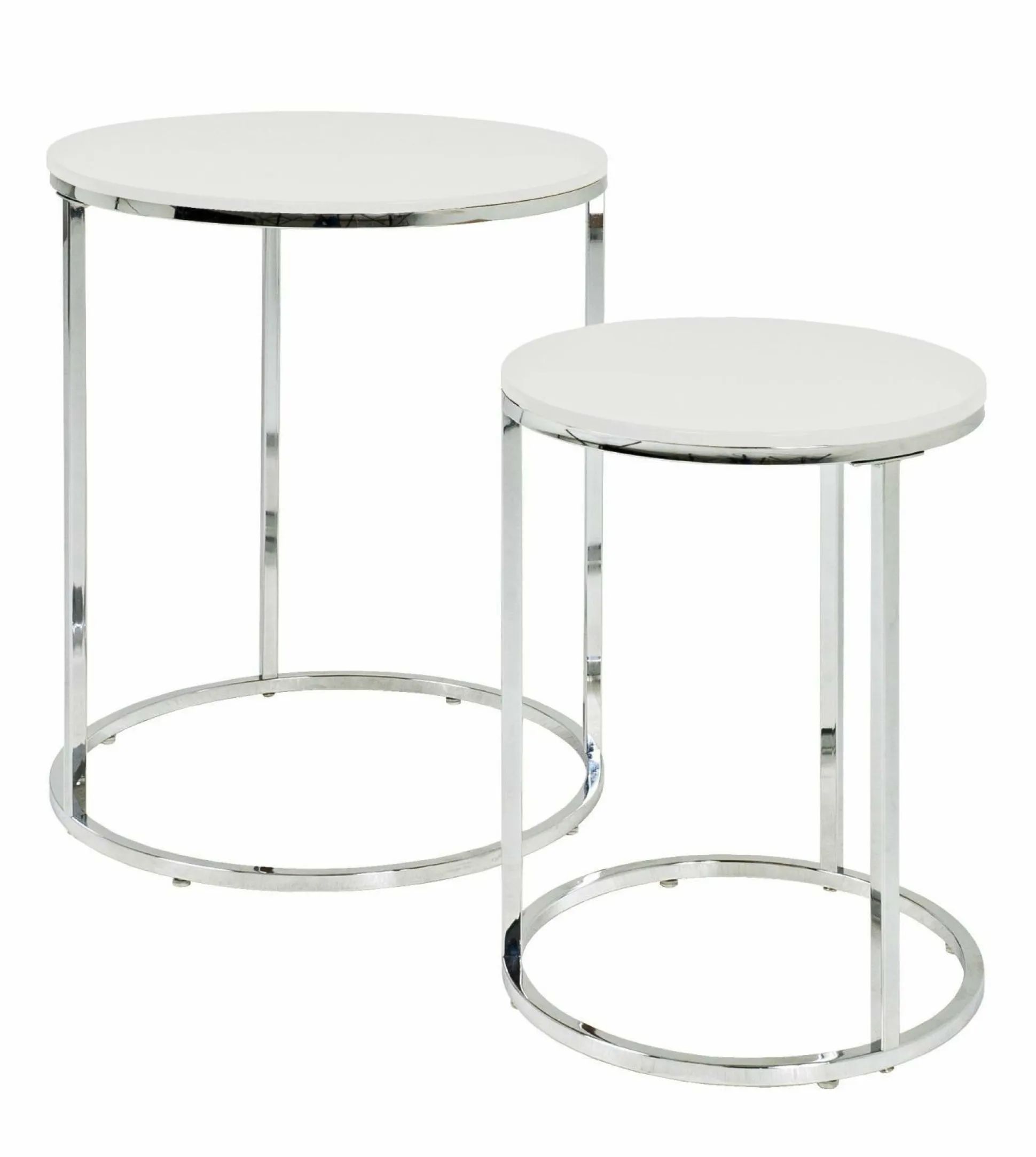 Der 2-teilige Beistelltisch besteht aus verchromtem Stahl. Die Ablagen wurden aus MDF Dekor in Hochglanz weiß gefertigt. Das dezente und runde Design passt zu verschiedenen Einrichtungsstilen.